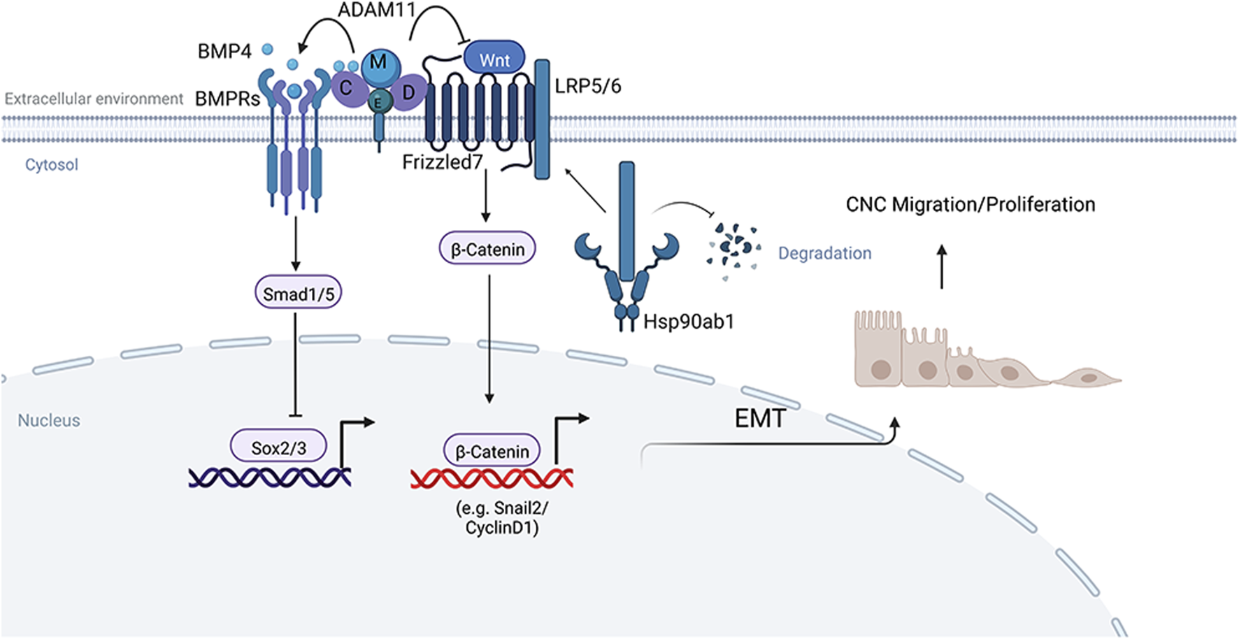 Model of Adam11 function. Adam11 binds to BMP4 and Frizzled on the plasma membrane to increase BMP4 and decrease Wnt/β-catenin signaling. The result of the increased BMP4 signaling is the inhibition of the neural markers Sox2 and Sox3. The result of the decrease in β-catenin activity is a reduction in CyclinD1 and Slug/Snail2, leading to less cell proliferation and delayed EMT. Loss of Adam11 in CNC leads to an increase in Hsp90ab1 that is known to stabilize Lrp5/6 proteins, thus increasing the Wnt receptor signal and β-catenin translocation to the nucleus. Given the interaction of Adam11 with Fzd and Lrp, it is likely that the increase in Hsp90ab1 is a feedback loop reinforcing the pathway rather than the initial trigger of β-catenin activation. Adapted from “Signaling Pathways Underlying EMT and EndMT: Emerging Roles in Age-related Macular Degeneration (AMD)”, by BioRender.com (2022). Retrieved from https://app.biorender.com/biorender-templates.