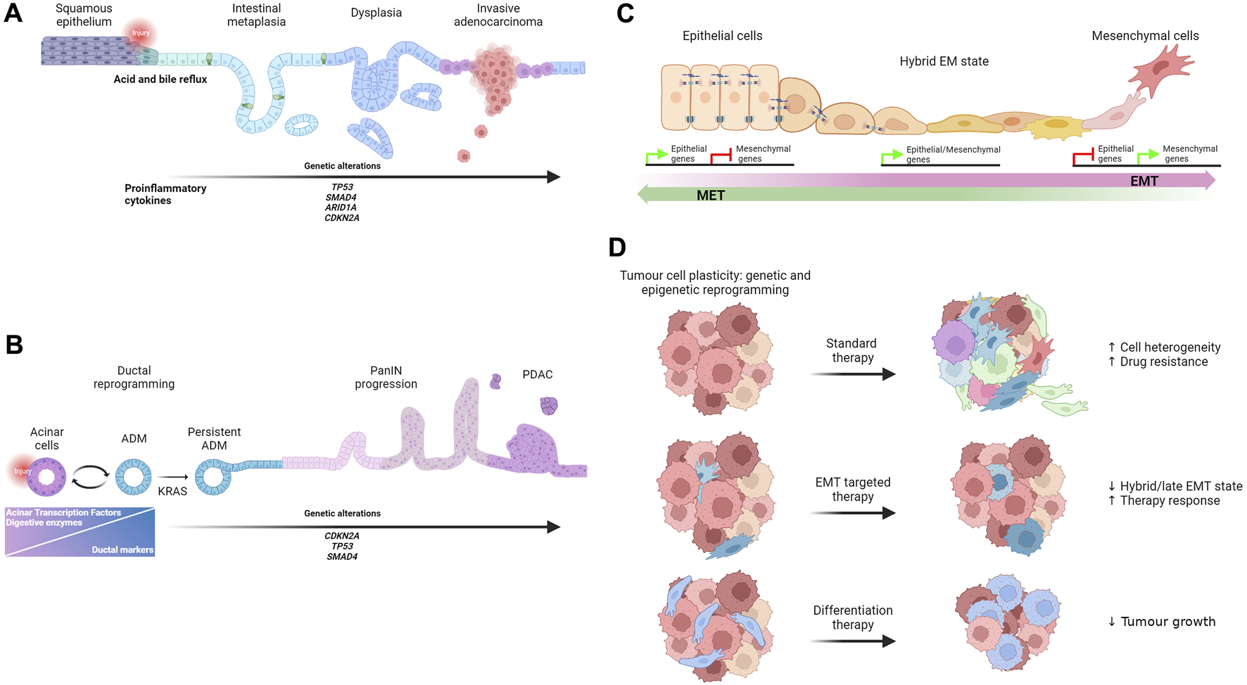 (A) Schematic representation of BE initiation and progression to adenocarcinoma. (B) Model of ADM origin and progression to PDAC. (C) Illustration of morphological changes that occur during the process of EMT as well as during the reverse process. (D) Schematic overview of drug response in cancer.