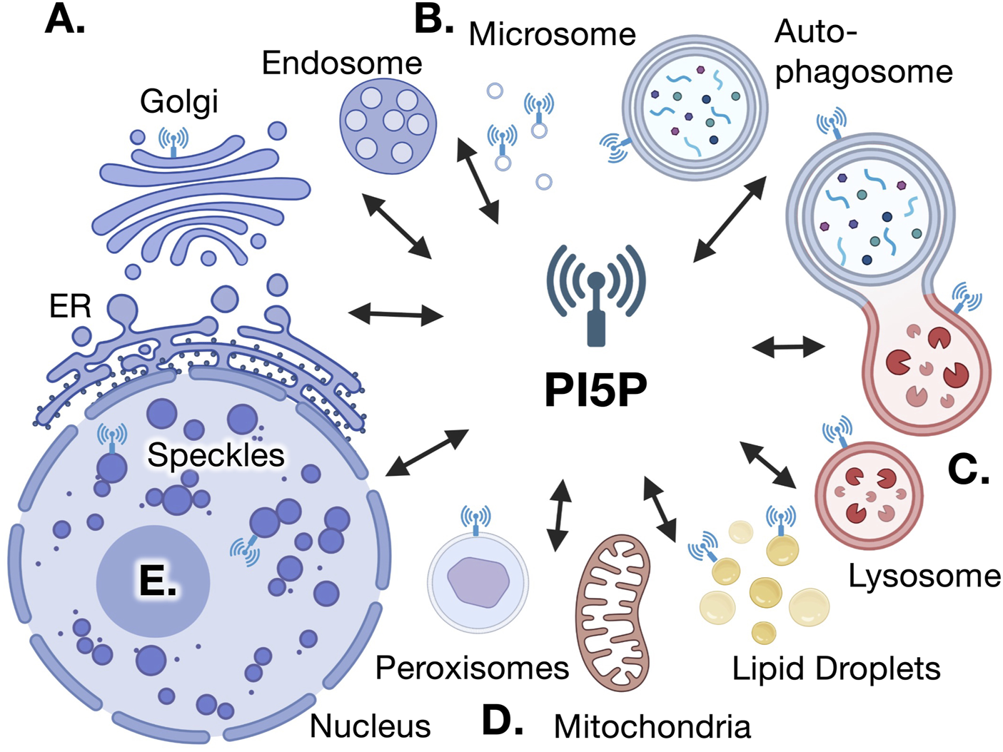 FIGURE 1. Putative sites of PI5P localization and action. Several lines of evidence support the existence of PI5P within various intracellular compartments, which reciprocally communicate various aspects of cell physiology. (A). PI5P was found by direct HPLC measurements in cellular fractions that colocalize with Golgi vesicles, also co-localized with PIP4Kγ (Sarkes and Rameh, 2010). (B). HPLC measurements of PI5P at light microsomal vesicles have been co-localized with PIP4K sites (Sarkes and Rameh, 2010). (C). Localization of the PI(4,5)P2 4-phosphatase TMEM to lysosomes and endosome is expected to generate PI5P at these signaling interfaces (Zou, et al., 2007; Hashimoto, et al., 2018). The presence of GFP-PHD and PIP4Ks around autophagosomes and autolysosomes also suggest the presence of PI5P in these organelles (Vicinanza et al., 2015; Lundquist et al., 2018). (D). PI(4,5)P2 synthesis at the peroxisome occurs in a PIP4K-dependent manner, strongly suggesting the presence of PI5P in this organelle (Hu et al., 2018; Ravi et al., 2021) and the use of ING2-PHD probes indicate that PI5P may be present surrounding lipid droplets (Akil et al., 2016). (E). Direct mass assay measurements have detected PI5P in the nucleus (Jones, et al., 2018). Together, these data suggest PI5P is not evenly distributed across all cellular membranes, suggesting spatially separated and specific functions for PI5P in various cellular compartments.