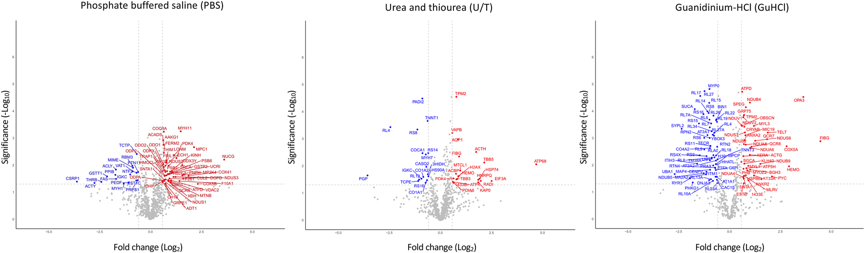 Volcano plots of differentially expressed proteins. Analysis was performed on the three fractions resulting from various extraction procedures. Non-significantly (grey) and significantly down- (blue) and upregulated (red) proteins in treadmill training (O-T) vs. sedentary (O-S) mice (with fold change <2 or >2) are shown. p-value was set to match q-value < 0.05.