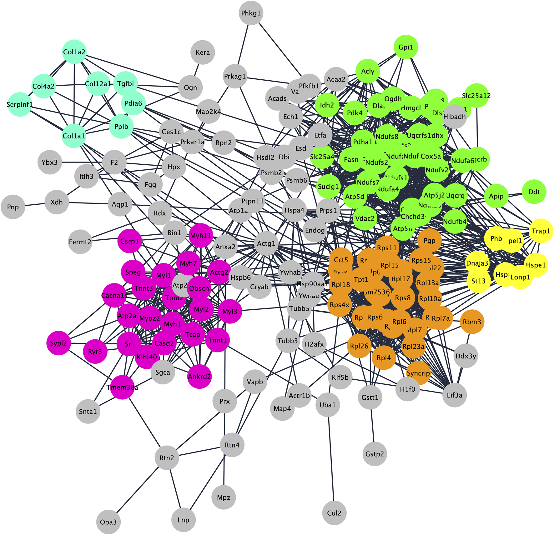 Protein–protein interaction and enrichment analysis of 192 DEPs obtained by STRING. Networks (clusters) with 8 or more proteins (densely connected nodes) were colored in green (cluster 1; mitochondrial processes), orange (cluster 2; cytoplasmic translation pathways), pink (cluster 3; regulation of skeletal muscle contraction), light blue (cluster 4; chaperone-dependent protein refolding) and yellow (cluster 5; collagen-activated signaling pathways).