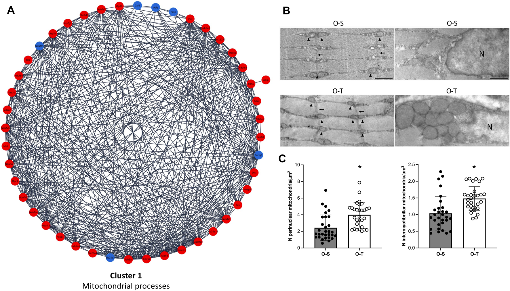 Mitochondria proteomics and ultrastructure. (A) Differential expression of proteins belonging to cluster 1 showing up- (red) and down- (blue) regulated proteins in mice undergoing adapted physical training compared to sedentary animals. (B) Intermyofibrillar (left) and perinuclear (right) mitochondria in representative ultrastructural images of gastrocnemius myofibers from old sedentary (O-S) and old trained (O-T) mice. Intermyofibrillar mitochondria are indicated by arrowheads and Z-lines by thin arrows. Bars: 500 nm. N = nucleus (C) The mitochondrial density is expressed as number of mitochondria per myofiber area far from myofiber periphery (intermyofibrillar mitochondria) or per cytoplasmic area surrounding myonuclei (perinuclear mitochondria). Scatter dot plots show individual values, mean ± SD. *p < 0.001.