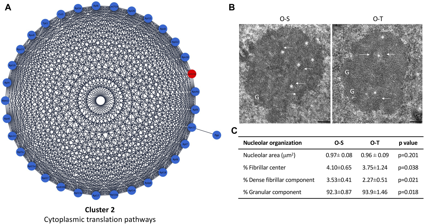 Cytoplasmic translation pathways and nucleolar ultrastructure. (A) Differential expression of proteins belonging to cluster 2 showing up- (red) and down- (blue) regulated proteins in mice undergoing adapted physical training compared to sedentary animals. (B) Ultrastructural images of nucleolus of old sedentary (O-S) and old trained (O-T) mice. Bars: 200 nm. Dense fibrillar component (arrow), fibrillar center (asterisk) and granular component (G) are shown. (C) The nucleolar area, the percentage of nucleolar areas occupied by fibrillar center, dense fibrillar component and granular component in O-S and O-T are reported.