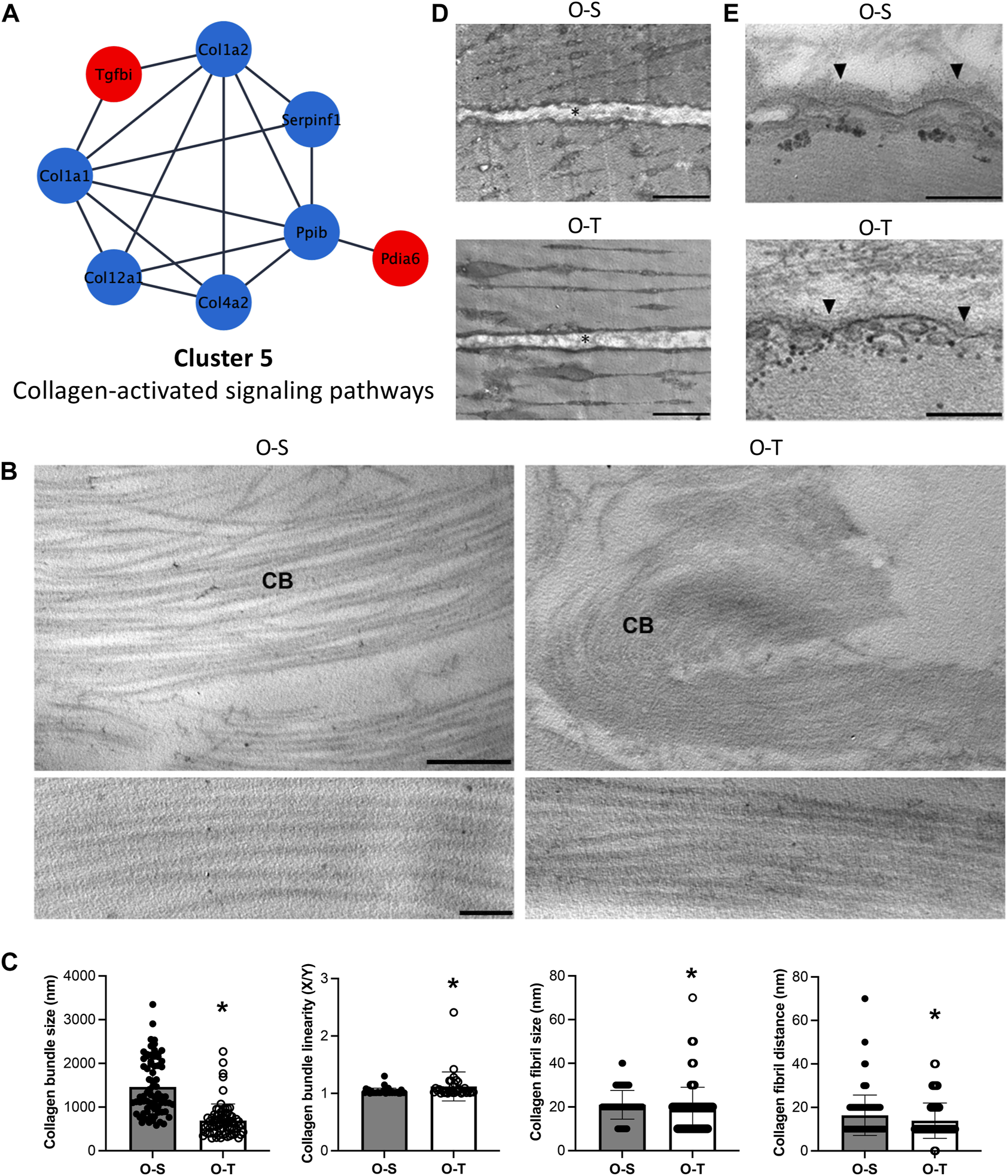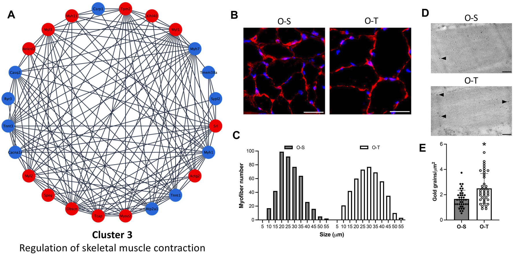Interestingly, regulatory proteins (i.e., ankyrin, obscurin, telethonin) were all upregulated in O-T mice (log2Fold change O-T/O-S = 1.5712, 0.6121, and 1.8802, respectively) (Figure 5A; Supplementary Table S3) and immunolabelling confirmed the upregulation of telethonin in O-T compared to O-S mice (Figures 5D, E).