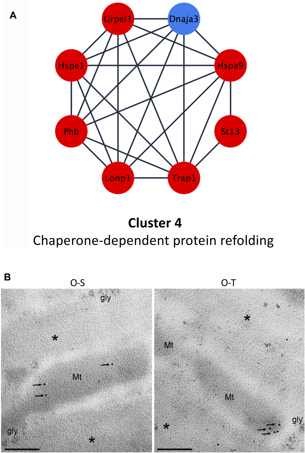 Chaperone-dependent protein refolding. (A) Differential expression of proteins belonging to cluster 4 showing up- (red) and down- (blue) regulated proteins in trained compared to sedentary mice. (B) mtHsp70 immunolabeling on aldehyde-fixed and LRWhite-embedded samples. Representative ultrastructural images of mtHsp70 immunolabeling (arrows) on mitochondria (Mt) in old sedentary (O-S) and old trained (O-T) mice. *myofibrils; gly, glycogen deposit. Bar: 200 nm.