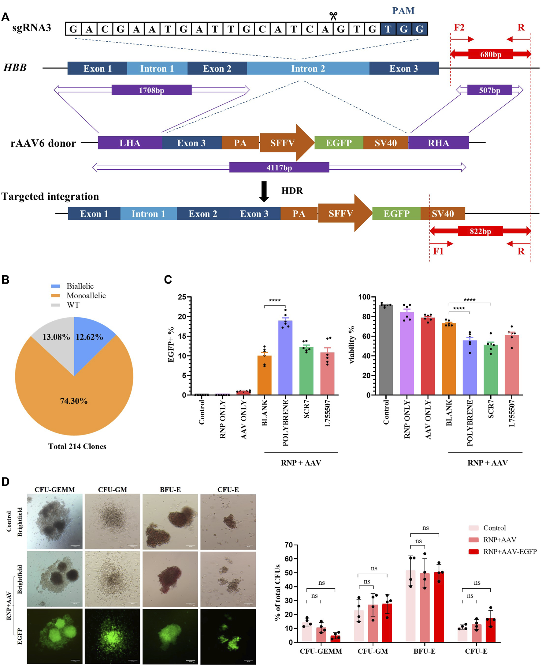 The AAV vector plasmids containing inverted terminal repeats (ITRs) from AAV serotype 2 (AAV2) were purchased from PackGene Biotech. The 4.7 kb AAV packaging capacity limits the size of the donor. So the rAAV6 homologous recombination repair template was designed to contain a 1708 bp arm and a 507 bp arm of the β-globin locus (Figure 1). The donor also contained BGH polyA, EGFP, and SFFV promoters. The rAAV6 virus was purchased from PackGene, and the titer value was determined to be 1E+13 GC/mL by quantitative PCR detection. The prepared rAAV6 virus vector was divided and stored at −80°C for future use.
