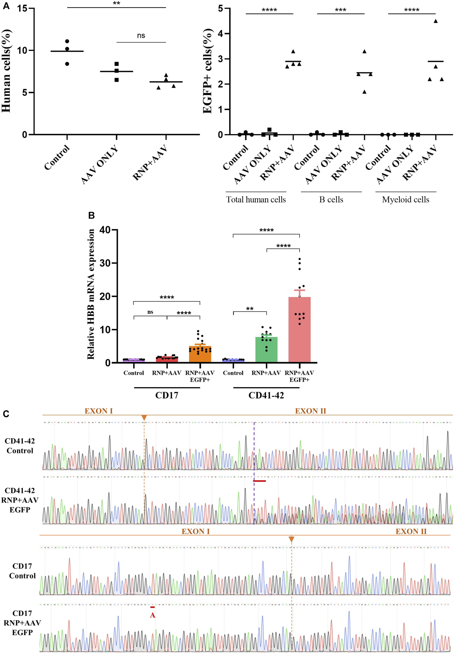 The HSCs derived from CD41–42 patients mobilized peripheral blood HSCs were used to determine whether the gene-corrected HSCs retained the engraftment ability because of their high clinical relevance. Four days after the electroporation of the Cas9/sgRNA–RNP complex and AAV6 donor delivery, an equivalent cell dose of 106 viable CD41–42 corrected EGFP+ HSCs was transplanted into NSI mice by tail-vein injection. After 16 weeks post transplantation, the mice were euthanized and BM was harvested to determine the implantation rate. The data in the Control and AAV ONLY groups were derived from three transplanted mice, and the data in the RNP + AAV group were obtained from four transplanted NSI mice. All groups of transplanted mice displayed human engraftment in the BM, as evidenced by flow detection in the presence of hCD45+/HLA-ABC double-positive cells (Supplementary Figure S4A). Compared with the Control group, the treatment groups showed a decrease in the rates of human cell chimerism, and the AAV ONLY and RNP + AAV groups displayed similar chimerism rates (Figure 4A). The percentage of EGFP expression in human cell chimerism was 2.9%. In addition, the myeloid (CD33) and lymphoid (CD19) reconstitution had averages of 2.9% and 2.45% EGFP+ cells, respectively (Figure 4A). Collectively, these results confirmed that the gene-targeted HSCs have engraftment potential and lineage reconstitution ability in vivo.