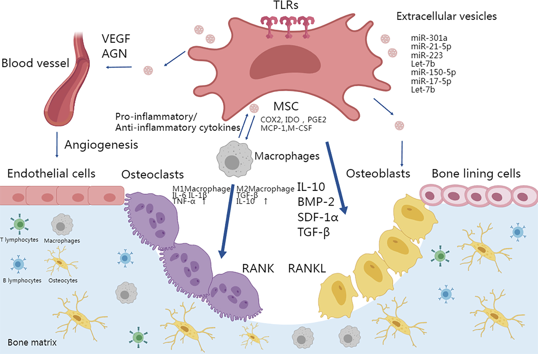 The MSCs originated from different tissues possess the capability to undergo differentiation into osteoblasts and terminally the most abundant osteocytes upon exposure to various osteogenic signals, underlying their importance in regenerative medicine (Pipino and Pandolfi, 2015). Moreover, following fracture or bone defects, MSCs transport or migrate to the site of injury via the peripheral blood circulation, thereby augmenting the regenerative capacity of the local MSC population. Besides the bone formation effects, MSCs establish interactions between bone formation and resorption via RANKL (receptor activator of nuclear factor kappa B ligand)/RANK coupling to modulate the activity of osteoclasts (Ikebuchi et al., 2018; Schlundt et al., 2018). Considering the accompanied damage of blood vessels during bone injury, MSCs also promoted angiogenesis by secreting pro-angiogenic factors thus activating endothelial cells (Grote et al., 2013).