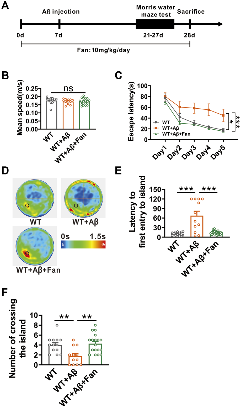 FIGURE 3. Fan attenuates Aβ1-42-induced spatial learning and memory deficits in mice. (A) The flow chart of animal experiment. (B) Mean speed travelled in the Morris water maze during adaptation phase. n = 12–18 in each group. (C) The escape latency for finding the hidden platform during training sessions in the Morris water maze. n = 12–18 in each group. (D) Average heatmap during the probe test in the Morris water maze. (E) The latency to first entry to the platform-zone during the probe test in the Morris water maze. n = 12–18 in each group. (F) The number of entries into the platform-zone during the probe test in the Morris water maze. n = 12–18 in each group. Data are presented as mean ± SEM, *p < 0.05, **p < 0.01, ***p < 0.001.