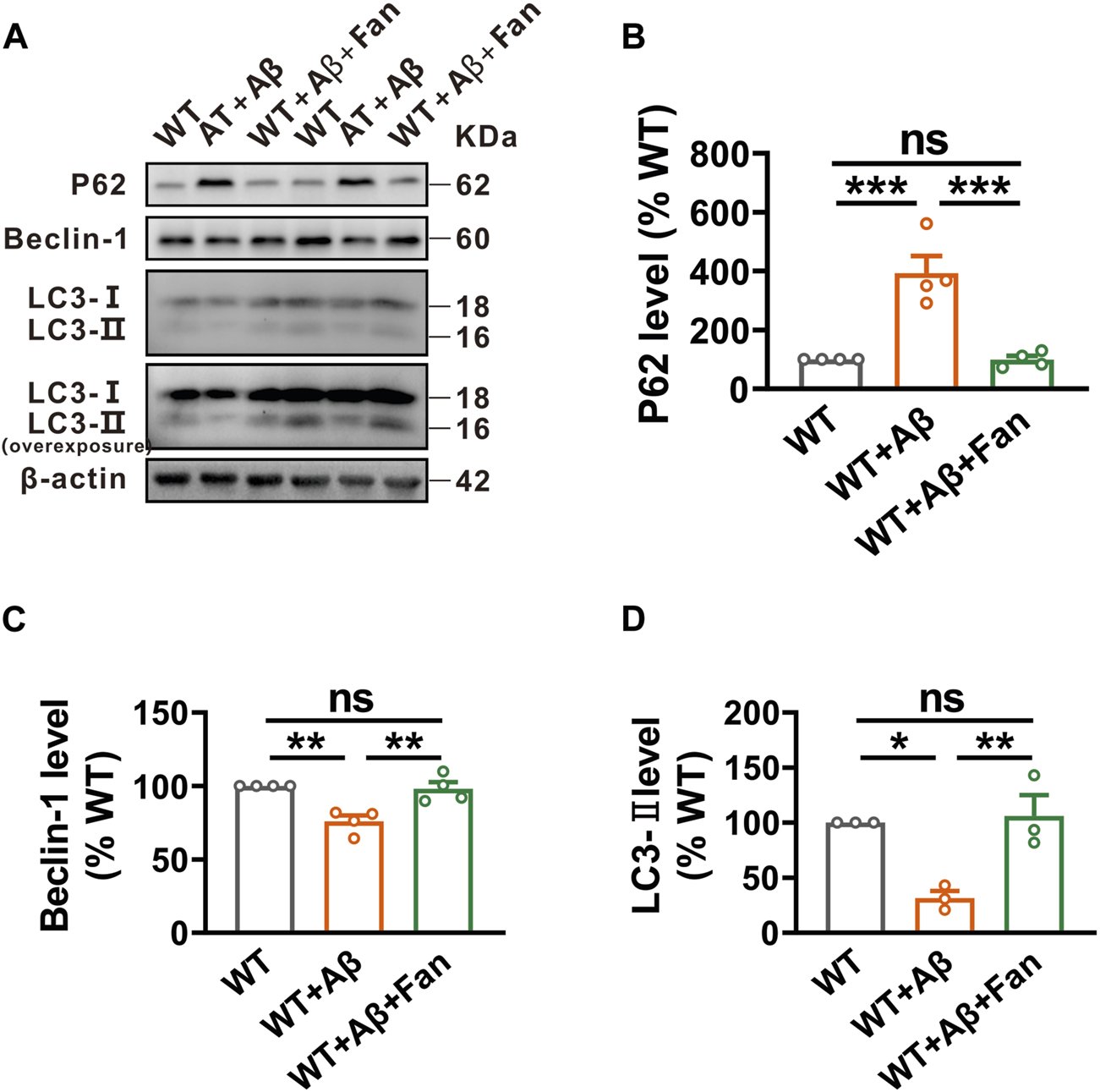 Give Fan’s capacity to promote autophagy in N2AAPP cells, an in vitro AD model, we undertook to investigate Fan’s potential role on regulating autophagy in the Aβ1-42-induced mouse model of AD. It was found that Aβ1-42 treated mice showed obviously impaired autophagic function compared with WT mice, as demonstrated by the increased levels of P62 (n = 4, 392.88% ± 58.52%, p < 0.001 vs. WT; Figure 4B) and the decreased levels of Beclin-1 (n = 4, 75.87% ± 4.02%, p = 0.002 vs. WT; Figure 4C) and LC3-II (n = 3, 31.58% ± 6.36%, p = 0.013 vs. WT; Figure 4D). Remarkably mirroring the in vitro results, Fan treatment was found to facilitate autophagy in Aβ1-42-induced mouse model of AD, as shown by the restoration of P62 (n = 4, 99.40% ± 13.12%, p < 0.001 vs. WT + Aβ, p = 1.000 vs. WT; Figure 4B), Beclin-1 (n = 4, 98.08% ± 4.54%, p = 0.004 vs. WT + Aβ, p = 0.922 vs. WT; Figure 4C) and LC3-II (n = 3, 106.14% ± 18.81%, p = 0.009 vs. WT + Aβ, p = 0.925 vs. WT; Figure 4D).