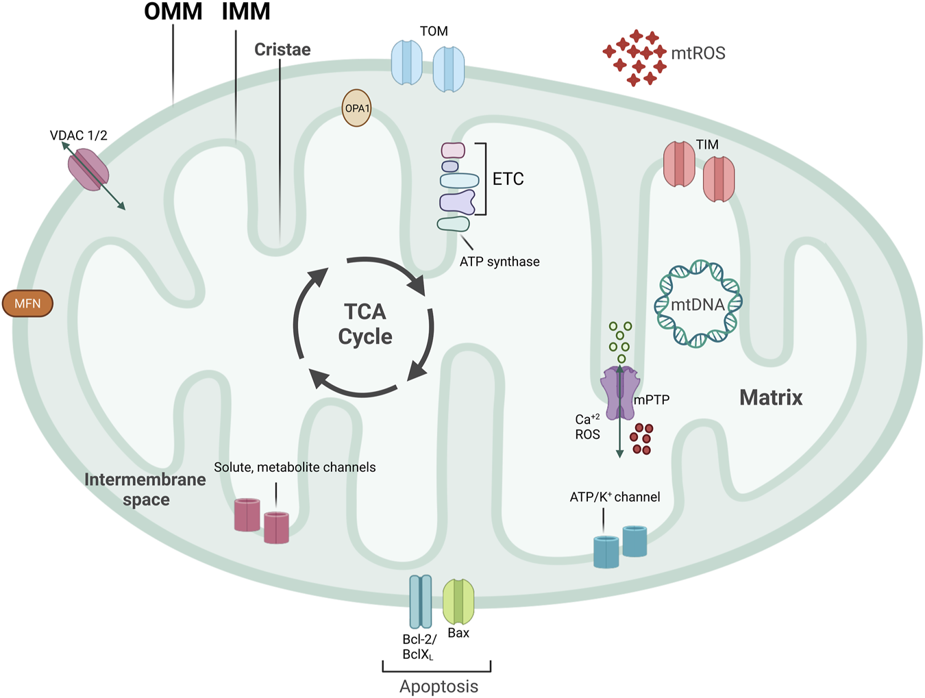 Mitochondrial structure. Mitochondria are double-membraned organelles with cristae formation. Mitochondria functioning is central for bioenergetic activities, producing ATP, an important source of ROS production. Mitochondria have several channels and pores to allow for metabolite and protein import, pivotal for inter-organelle communication. Part of ETC subunits are encoded in mitochondria’s circular DNA, named mtDNA. TCA cycle that produces important electron carriers for ETC, as well as ATP, and resides on the IMM. mtROS, mitochondrial reactive oxygen species; ETC, electron transport chain; mtDNA, mitochondrial DNA; IMM, inner mitochondrial membrane; OMM, outer mitochondrial membrane; mPTP, mitochondrial permeability transition pore; VDAC, voltage-dependent anion channel.