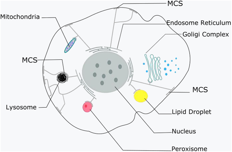 The main locations of MCSs. ER contacts with other membranous organelles and plasma membrane. It is shown that nearly all other membranous organelles, as well as the plasma membrane, have contact with the ER.