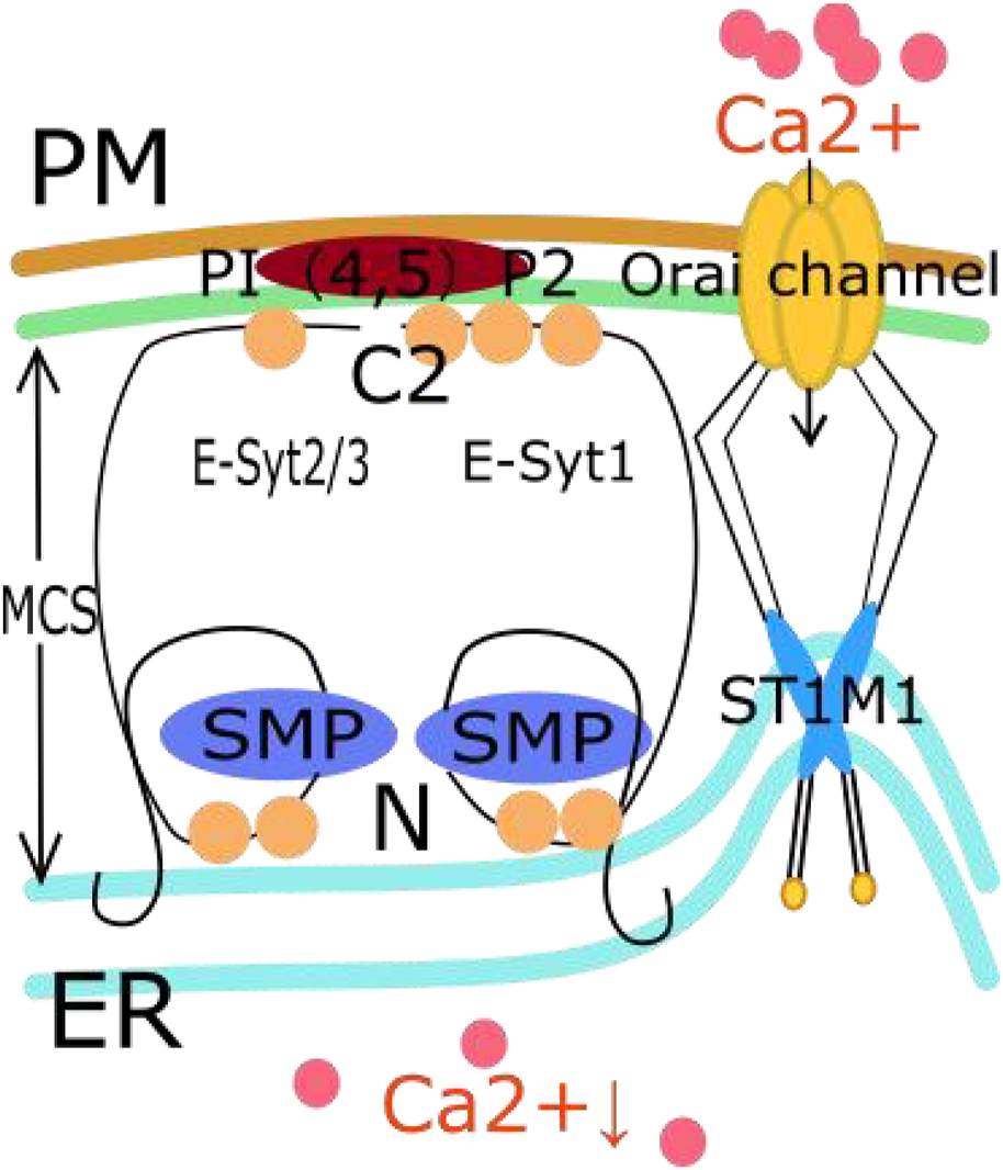 Although ER-PM contacts have been recognized for a long time, the molecular mechanisms that drive these contacts remain unknown. Based on electron micrographs, the distance between the ER and PM at contact sites was calculated to be 10–30 nm, indicating the presence of a tether determining the unique distance and function, which corresponds to an MCS (Orci et al., 2009; Fernández-Busnadiego et al., 2015). Recently, extended synaptotagmins (E-Syts) have been shown to be active in regulating substance exchange at ER-PM contact sites (Quon and Beh, 2015; Quon et al., 2018). E-Syts are endoplasmic reticulum anchoring proteins that mediate connections between the ER and PM. They also function as a link between the two membranes, allowing substances to be transferred between them.