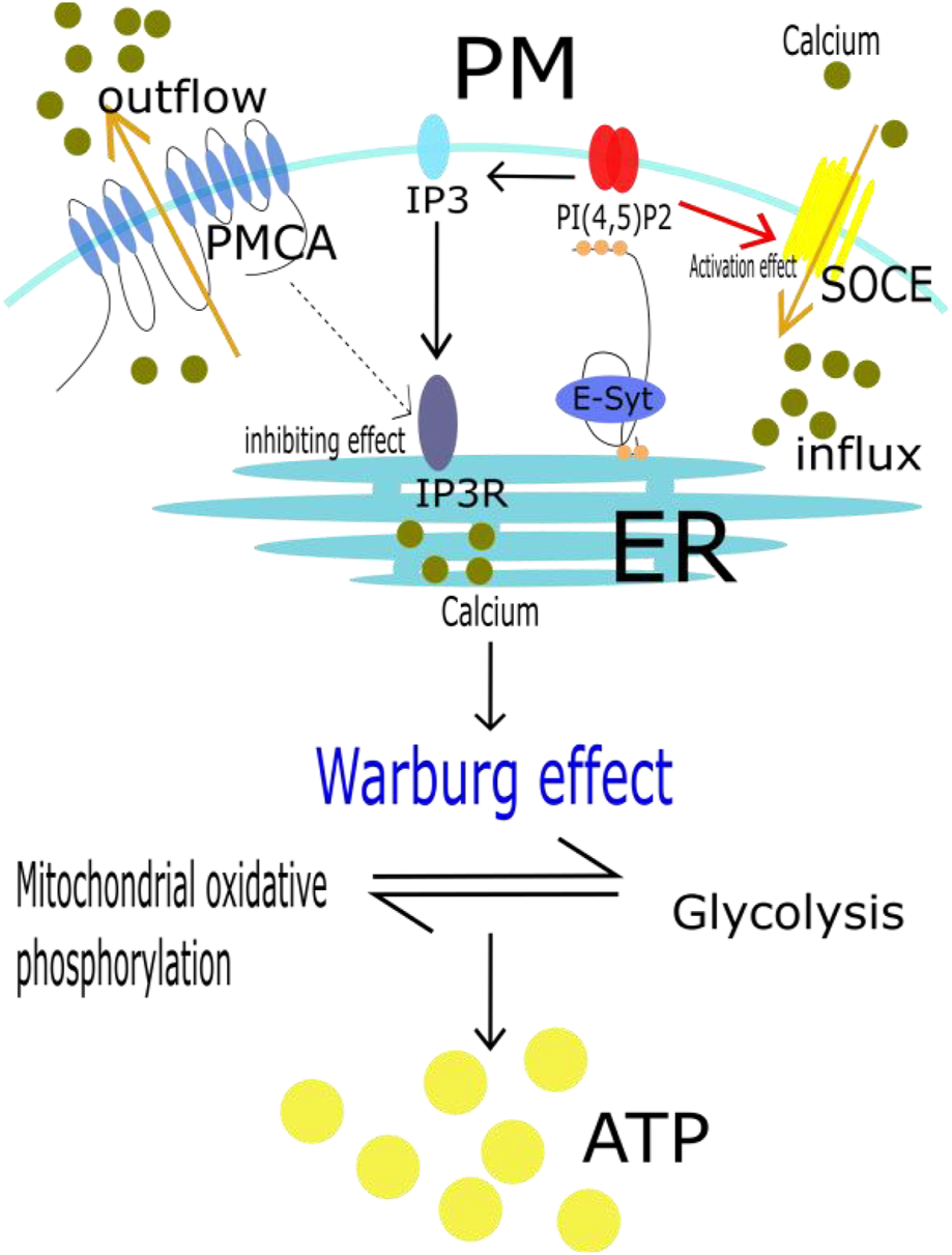 There are two pathways of glucose metabolism: mitochondrial oxidative phosphorylation and glycolysis. Glycolysis is inhibited in normal mammalian cells under aerobic conditions. However, tumor cells have the ability to switch between the two energy metabolism pathways, a phenomenon called the Warburg effect (Liberti and Locasale, 2016). Even in oxygen-rich conditions, glycolysis is activated in tumor cells, converting glucose into lactic acid to produce ATP, and this state is characterized by rapid proliferation and resistance to cell death. Glycolysis has long been considered a major metabolic process of energy production and anabolic growth in cancer cells (Porporato et al., 2018). Calcium plays an important role in this metabolic transition (Bondarenko et al., 2014; Bittremieux et al., 2016). Plasma membrane Ca2+ ATPase (PMCA) is closely involved in intracellular calcium concentration control. It reduces the calcium concentration in the cytoplasm not only by direct efflux but also by controlling inositol-1,4,5-triphosphate (IP3R) formation and reducing calcium release from the endoplasmic reticulum (Padányi et al., 2016). However, E-Syt senses a decrease in intracellular or endoplasmic reticulum calcium ion concentration in MCSs, which in turn anchors with PI (Porter and Palade, 1957; Okeke et al., 2016) P2. (Cortés et al., 2019; Dietz et al., 2022). The local concentration of PI (Porter and Palade, 1957; Okeke et al., 2016) P2 increases, and after decomposition, more IP3 is generated (Ehrlich et al., 2011; Chang and Liou, 2016). IP3 binds to receptors (IP3R) on the endoplasmic reticulum and initiates the release of calcium ions. In addition, an increase in local concentration of PI (Porter and Palade, 1957; Okeke et al., 2016) P2 can also activate the SOCE pathway and promote extracellular calcium influx (Chen YJ. et al., 2017). In other words, E-Syt, MCSs, SOCE and PMCA jointly regulate the intracellular calcium concentration. High calcium concentration further regulates the Warburg effect in tumor cells, resulting in proliferation and resistance to death (Riera Leal et al., 2020). This process is explained in Figure 3.