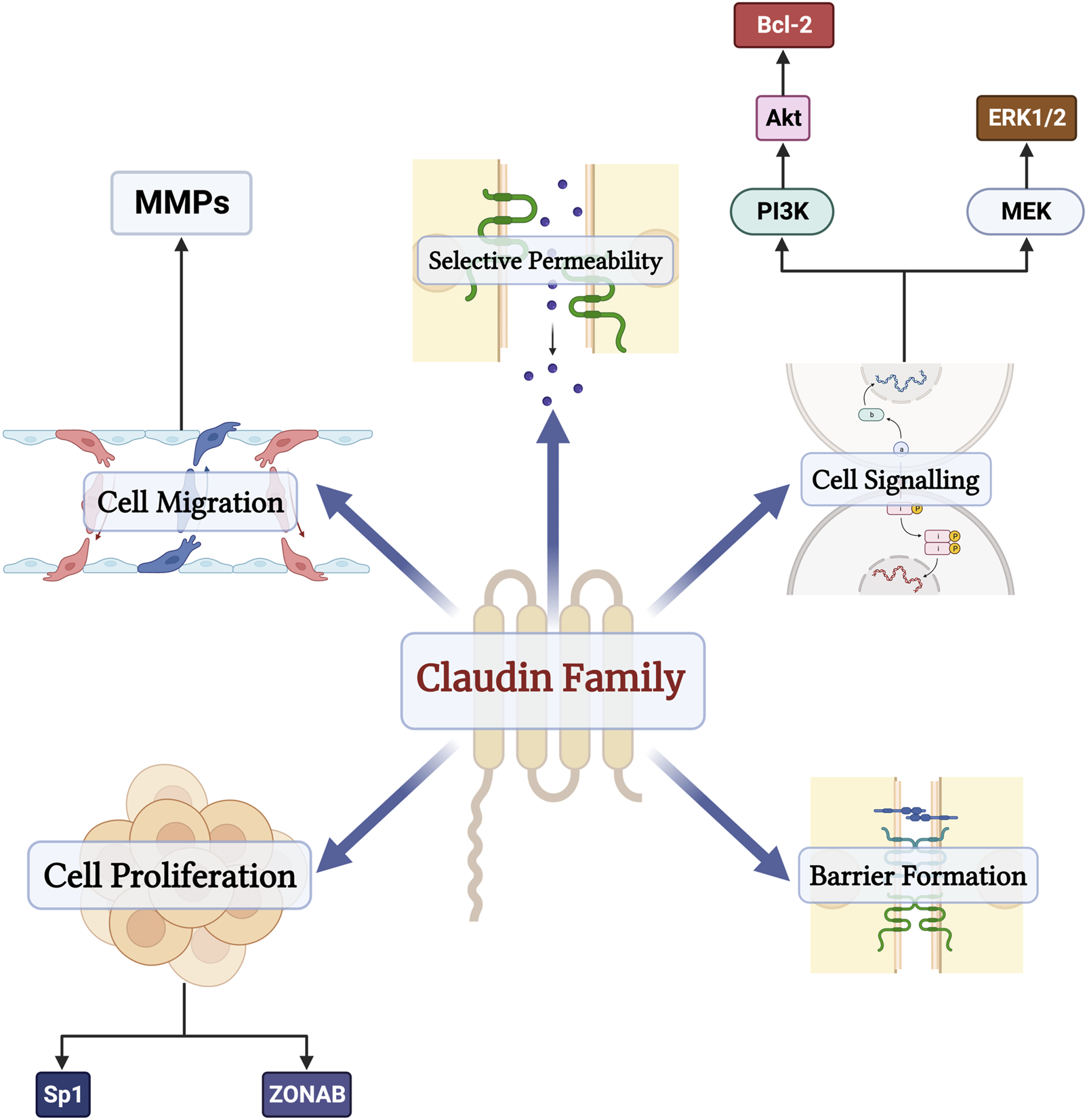 Figure 1. The physiologic functions of the claudin family of proteins in the human body. Besides their functions as barriers and channels, claudins also regulate cell proliferation through their interactions with transcription factors Sp1 and Zonula occludens 1-associated nucleic acid-binding protein (ZONAB), modulate cell migration through matrix metalloproteinases (MMPs), and serve as components of several signaling pathways such as MEK/ERK/1/2 and PI-3K/Bcl-2 pathways.