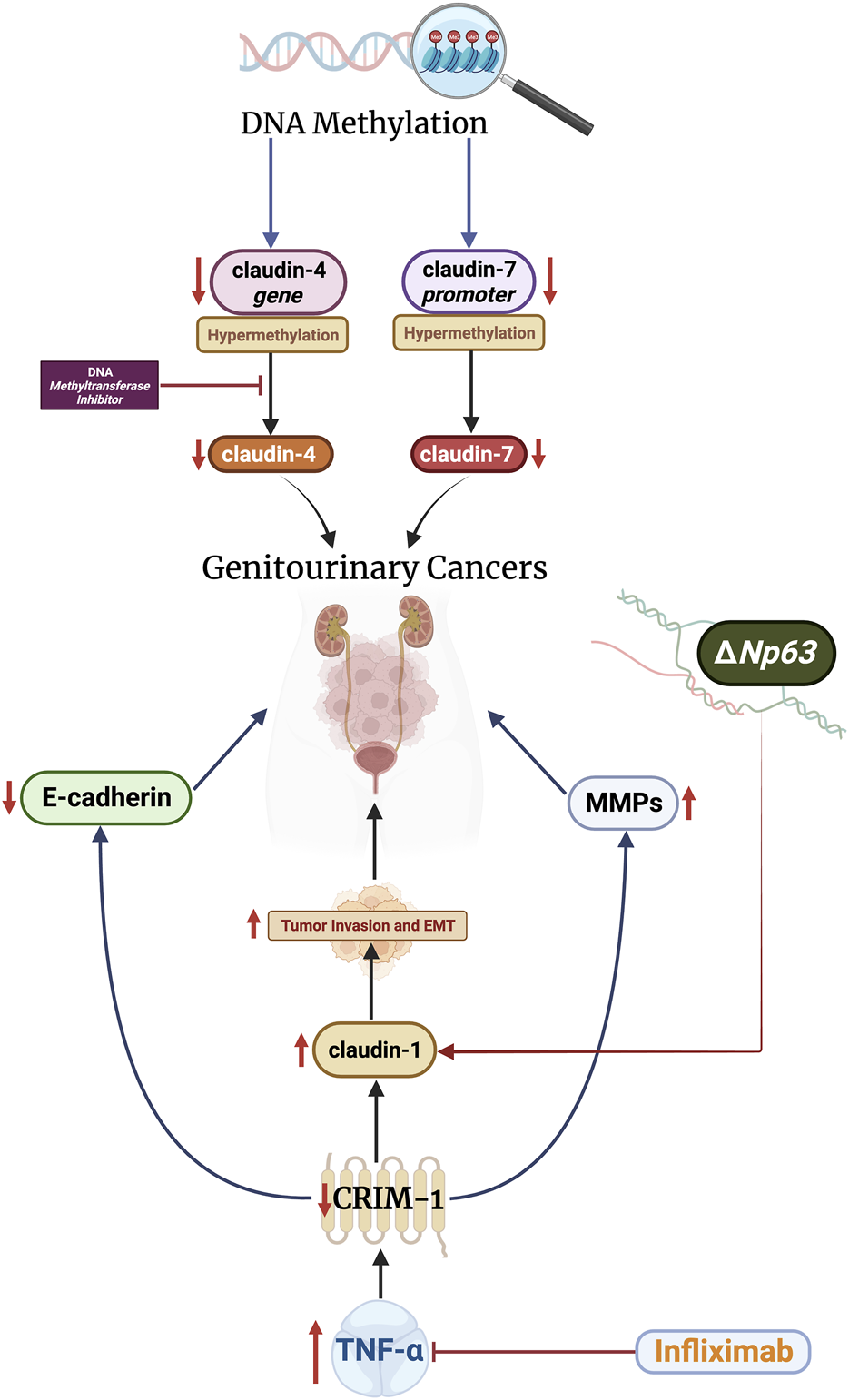 Transmembrane proteins, specifically cysteine-rich motor neuron-1 (CRIM-1), also regulate the expression of claudins in GU cancers. The CRIM-1 protein is highly expressed in the kidney and placenta cells (Kolle et al., 2000). Ogasawara et al. analyzed the effects of CRIM-1 on proliferation, malignant transformation, and claudin expression in RCCs (Ogasawara et al., 2018). The authors demonstrated that decreased expression of CRIM-1 does not impact tumor growth or proliferation. However, the authors revealed that under-expression of CRIM-1 increases tumor invasion and epithelial-mesenchymal transition by reducing E-cadherin expression and increasing claudin-1 and MMP-2 and -9 expression. Expression of CRIM-1 was blunted by tumor necrosis factor (TNF)-ɑ, indicating a potential therapeutic value of targeting this pathway. In line with this, treatment with infliximab, an anti-TNF-ɑ antibody, resulted in 16% of RCC patients achieving partial response and 16% achieving stable disease in a phase II trial (Harrison et al., 2007). Nevertheless, the efficacy of infliximab in RCC remains controversial and further studies are still needed (Larkin et al., 2010).