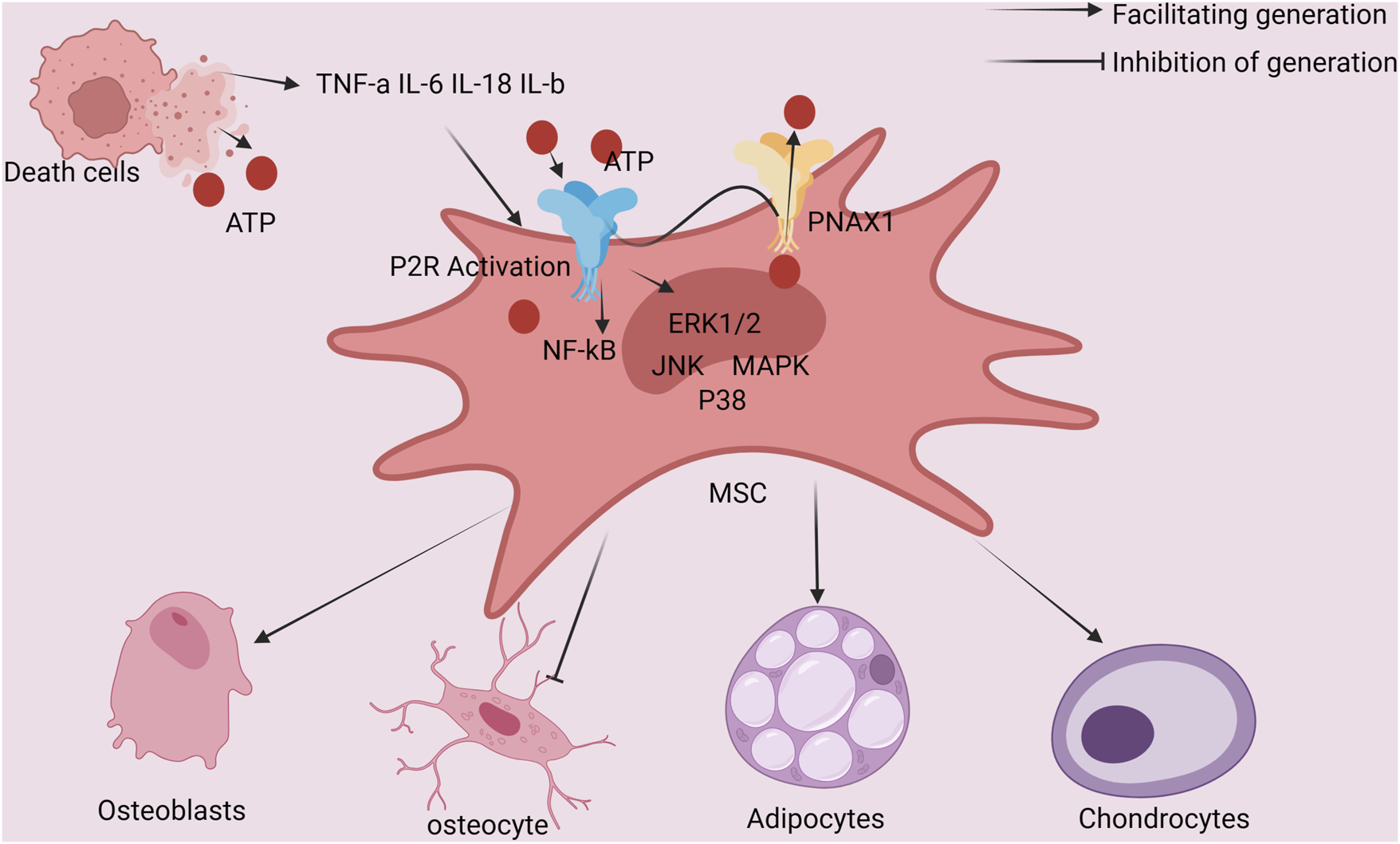 Schematic diagram of the interaction between ATP-induced cell death and bone Mesenchymal stem cells of the bone marrow: ATP activation of cells shows P2R, cell autosecretion of IL-1 and other factors, whereas ATP induction of cell death releases IL-18 and other factors that act on mesenchymal stem cells of the bone marrow. Additionally, P2R-positive cells that are stimulated by ATP also activate the P38 MAPK/JNK/ERK1/2/NF-kB signaling pathway, which encourages mesenchymal stem cells in the bone marrow to develop into OBs.
