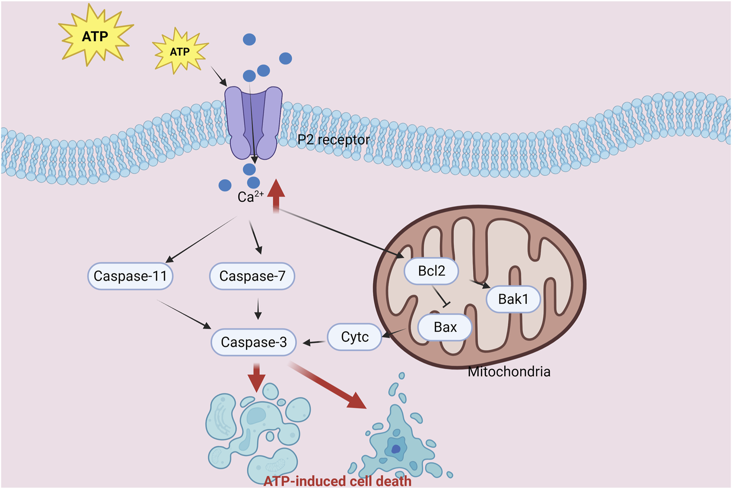 ATP fulfills crucial biological functions within cells, encompassing energy transfer, signal transduction, and cellular metabolism. Intracellular ATP levels are upheld by the delicate equilibrium between intracellular synthesis and consumption, known as ATP homeostasis. However, under external stimulation or internal injury, ATP homeostasis may be disrupted, resulting in an increase in extracellular ATP levels and the release of intracellular ATP. The result of this action is ATP-induced cell death. There are four main mechanisms and regulatory pathways that might cause ATP-induced cell death. Firstly, ATP can engage with extracellular purinergic 2 receptors (P2Rs), particularly P2X7 receptors, concurrently activating associated receptors such as NLRP1 (NOD-like receptor heat protein domain-associated protein 1) and NLRP3 (NOD-like receptor heat protein domain-associated protein 3). This activation initiates apoptotic signals, including caspase-1, caspase-3, and caspase-11, and involves necrotic proteins such as GSDME (Gasdermin-E) and GSDMD (Gasdermin-D). The culmination of these activations ultimately sets in motion the cell death process (Perregaux and Gabel, 1998; Ono et al., 2003; Piccini et al., 2008; Shiratori et al., 2010; Shoji et al., 2014; Toki et al., 2015; Amati et al., 2017a; Amati et al., 2017b; He et al., 2017). Secondly, The ability of ATP to bind to ion channels on the cell membrane helps to control the balance of ions within and outside of the cell. For instance, activation of P2R (purinergic 2 receptor), particularly the P2X7R, causes ion channels to open, increasing the concentration (including within the Golgi apparatus and mitochondria) of Ca2+ inside of cells. Consequently, nuclear DNA damage occurs, leading to cell death (Kim et al., 2005; Sehgal et al., 2017). Furthermore, ATP can induce a change in the loss of mitochondrial membrane potential (due to K+/Na+ imbalance on the cell membrane), disruption of the mitochondrial respiratory chain, production of reactive oxygen species (ROS), and altered mitochondrial membrane permeability, ultimately triggering cell death (Souza et al., 2012; Xue et al., 2016). Ultimately, it participates in the initiation of immune inflammation, activation of cell death, and ATP-induced cell death, resulting in the release of inflammatory mediators such as IL-1β, IL-18 (interleukin-18), TNF-α, IL-2 (interleukin-2), IL-4 (interleukin-4), IL-6 (interleukin-6), IL-a (interleukin-A), CCL5 (chemokine (C-X-C motif) ligand 5), and CXCL2 (chemokine (C-X-C motif) ligand 2), ultimately culminating in cell death. (refer to Figure 1) (Zheng et al., 1991; Di Virgilio, 1995; Li et al., 2021).