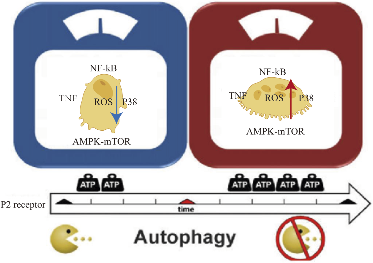 Diagram of the crosstalk between ATP-induced cell death and autophagy components: P2 cell membrane receptor activation, p38 AMPK-mTOR/NF-kB signaling pathway, TNF factor, and intracellular ROS increase with an increase in extracellular oxygen (ATP).