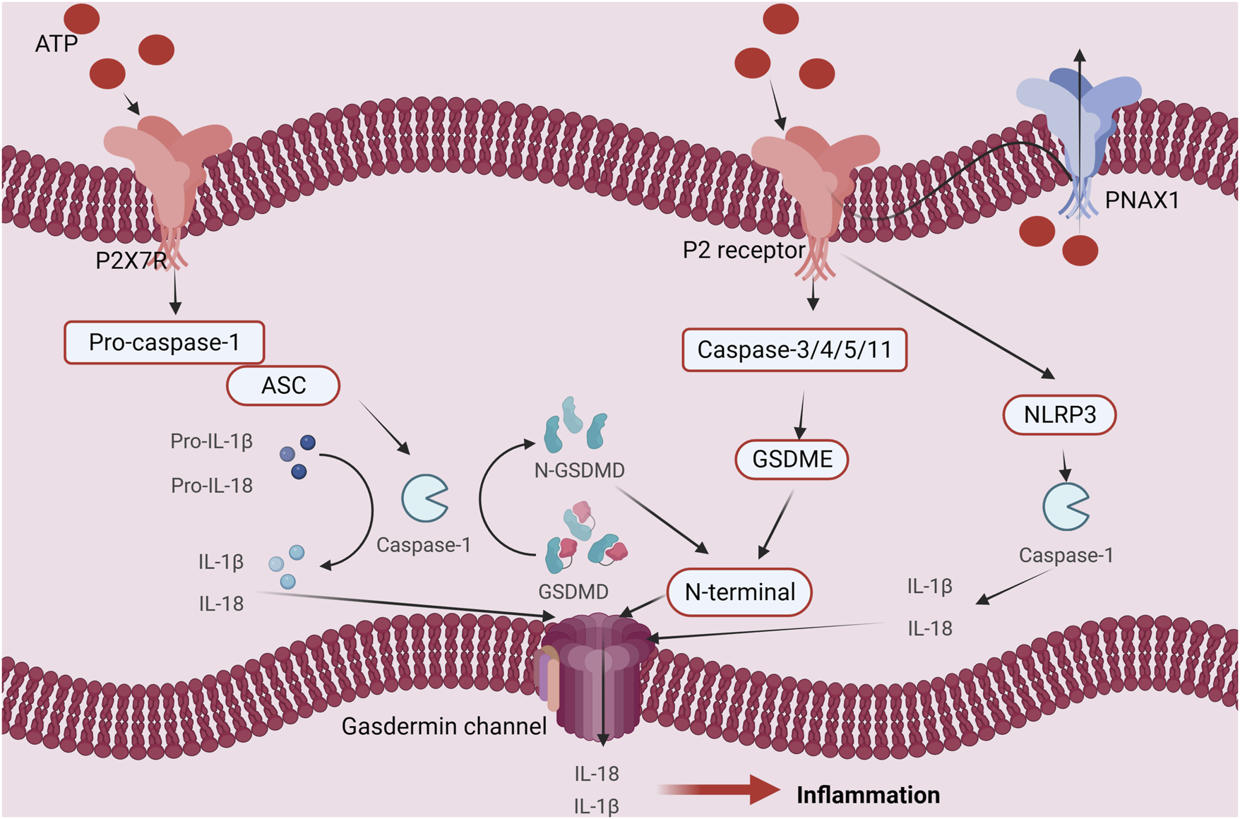 Crosstalk mechanism between ATP-induced cell death and pyroptosis components.