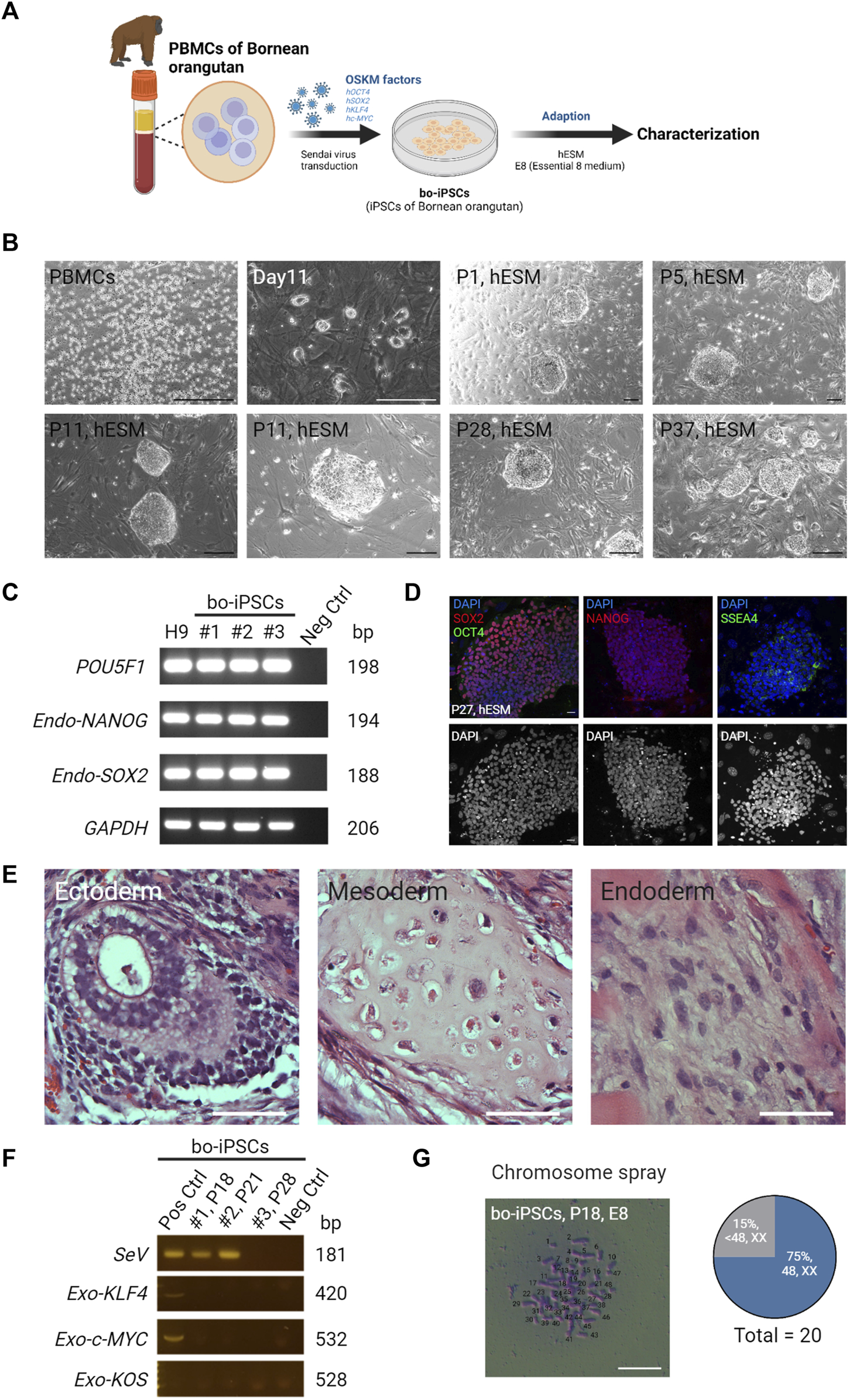 FIGURE 1. Generation and characterization of bo-iPSCs in hESM. (A) A schematic diagram depicting the derivation and in vitro maintenance process of bo-iPSCs. (B) Representative bright-field images showing Bornean orangutan PBMCs and round colony morphologies of bo-iPSCs cultured under hESM for long-term in vitro maintenance. Scale bars, 200 μm. (C) RT-PCR gel image demonstrating the expression of endogenous pluripotency markers (POU5F1, NANOG, and SOX2) in three bo-iPSC cell lines, namely, cell line 1 (#1, passage 18), cell line 2 (#2, passage 21), and cell line 3 (#3, passage 28), compared to H9 hESCs and a negative control (fibroblast cells). (D) Representative immunofluorescence images (upper panel) of bo-iPSCs cultured under hESM. Red indicates SOX2 and NANOG; green indicates OCT4 and SSEA4; blue indicates DAPI; the lower panel displays the DAPI staining in an 8-bit format. Scar bar, 25 μm. (E) Representative H&E images demonstrating the ability of bo-iPSCs cultured under E8 to differentiate into all three germ layers in teratoma formation. Scale bar, 50 μm. (F) RT-PCR showing the presence of Sendai virus genome (SeV) and exogenous OSKM genes (KOS, KLF4, and c-Myc) is detected in early passages of bo-iPSC cell line 1 (#1, passage 18) and cell line 2 (#2, passage 21), but is cleared in bo-iPSC cell line 3 (#3, passage 28). (G) Bright field image of chromosome spread revealing E8 bo-iPSCs with the characteristic display of normal chromosome numbers. Scale bar, 100 μm. Quantitative analysis of twenty E8 bo-iPSC cells demonstrates that 75% of the bo-iPSCs exhibited normal chromosome numbers.