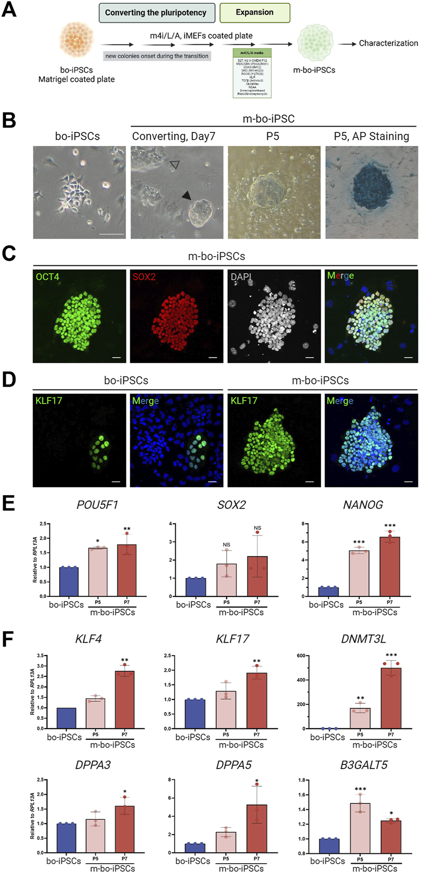 FIGURE 2. The pluripotent characteristics of bo-iPSCs cultured in m4i/L/A Medium. (A) Schematic representation of the process of bo-iPSCs adaptation from E8 to m4i/L/A medium, with the green box denoting the key components used in m4i/L/A medium. (B) Representative bright-field images illustrating the change in bo-iPSCs colony morphology during media adaptation from E8 to m4i/L/A, along with an alkaline phosphatase (AP) staining image of bo-iPSCs cultured in m4i/L/A (passage 5) showing positive AP activity. The black arrowhead indicates the domed-shaped colony, while the white arrowhead denotes the appearance of a flattened colony. Scale bars, 100 μm. (C,D) Representative immunofluorescence images of m-bo-iPSCs cultured under m4i/L/A at passage 5, demonstrating the sustained expression of OCT4 and SOX2 (C), as well as the induction of KLF17 of m-bo-iPSCs (D) by the m4i/L/A system in comparison to bo-iPSCs cultured under E8 at passage 33. Red indicates SOX2; green indicates OCT4 and KLF17; blue indicates DAPI. The gray colony image represents the 8-bit format of DAPI staining. Scar bar, 25 μm. (E,F) qRT-PCR analysis revealed significant differences in the expression levels of core pluripotent genes, POU5F1 and NANOG (E), and several pluripotency regulating markers in m-bo-iPSCs (F). RPL13A was used as the internal control. Biological replicates, n = 3. Asterisks indicate *p < 0.05, **p < 0.01, and ***p < 0.001.