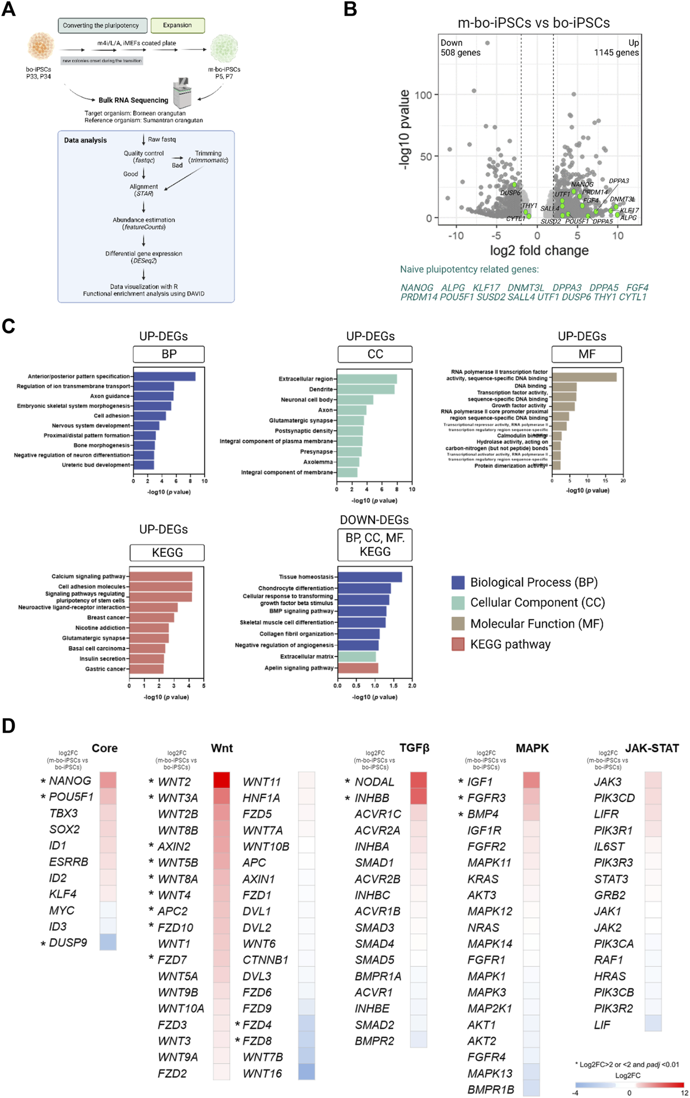 The raw fastq files were assessed using FastQC v0.11.9, and the results were summarized using MultiQC v1.13. Trimmomatic v0.39 was utilized for adapter removal and quality filtering of low-quality bases. The trimmed and untrimmed reads were then aligned to the Pongo abelii Susie_PABv2 reference genome with Ensembl v108 annotations using STAR v2.7.10b. The mapping rate for all bo-iPSC samples ranged from 77.2% to 78.8%. The featureCounts command line was employed to count the mapped reads for genes using the Rsubread v2.0.1 package. Differential gene expression analysis was conducted using DESeq2 v1.38.3, with a p-value cut-off of 0.05 and an absolute log2 fold change (log2FC) cut-off of 2.00, indicating statistical significance. To compare our RNA-Seq dataset with published RNA-Seq datasets (Accession number: GSE135991 (Yu et al., 2021), GSE75868 (Theunissen et al., 2016), E-MTAB-4461 (Guo et al., 2016)) representing different pluripotent statuses, we followed the same bioinformatic workflow and visualized the results using Principal Coordinate Analysis (PCoA) with the phyloseq v1.42.0 package.