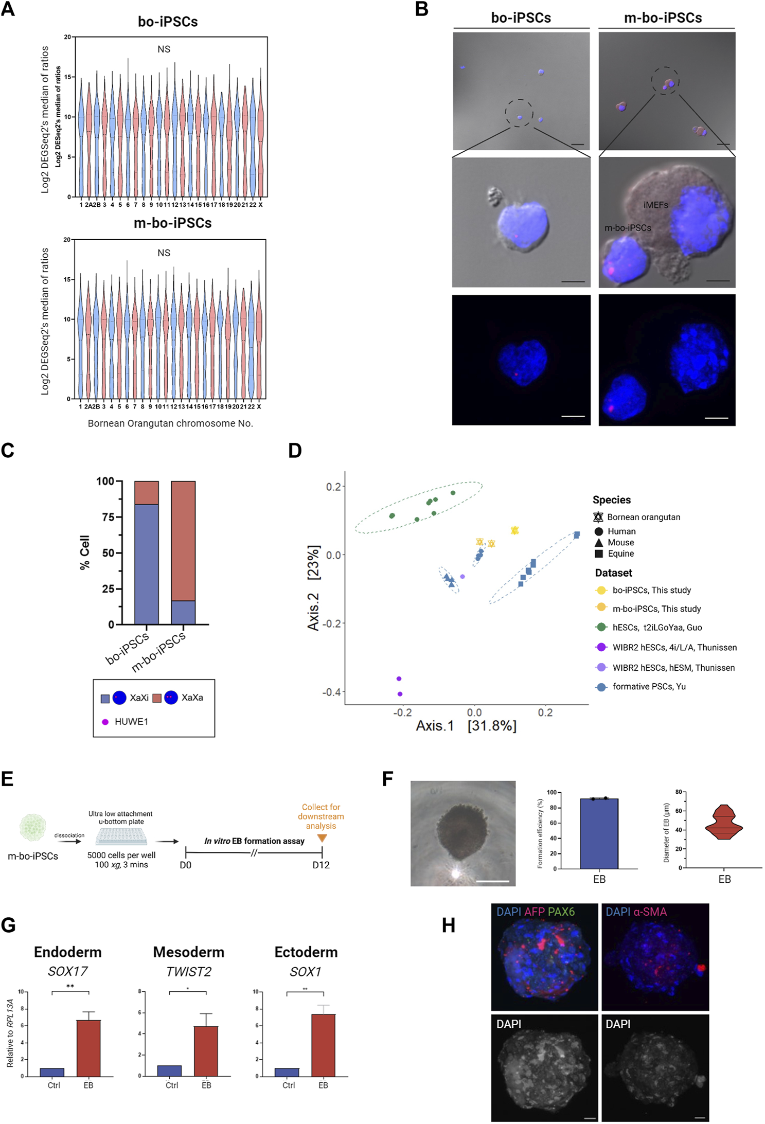 FIGURE 4. Characterization of m-bo-iPSCs. (A) Violin plots illustrate no significant difference in the gene expression levels of each chromosome between bo-iPSCs and m-bo-iPSCs. (B) Representative merged bright-field and fluorescence RNA ISH (top) and fluorescence RNA ISH (bottom) images revealing distinct X chromosome activation status of bo-iPSCs and m-bo-iPSCs, detected by HUWE1 nascent transcripts (red) in DAPI-stained nuclei (blue). Scale bar, 10 μm. (C) Bar plot quantification of the RNA ISH patterns in bo-iPSCs and m-bo-iPSCs, demonstrating a higher proportion of bi-allelic HUWE1 expression in m-bo-iPSCs. (D) PCoA plot of RNA-seq datasets depicting the pluripotency characteristics of the mouse (mESC, XPSC, and miPSCs), human (mESC, XPSC, and miPSCs), horse (FTW-eqESC and FTW-eqiPSC), bo-iPSCs and m-bo-iPSCs samples. (E) Schematic diagram outlining the experimental design for inducing spontaneous in vitro EB formation of m-bo-iPSCs. (F) The representative bright-field image displays the morphology of EB from m-bo-iPSCs. Scale bar, 25 μm. Box plots showing the high EB formation efficiency in m-bo-iPSCs, and a violin plot representing the diameter distributions of EB. (G) qRT-PCR results demonstrating significant expression levels of three germ layer markers in EB compared to the m-bo-iPSCs before in vitro differentiation (used as control). Endoderm: SOX17, mesoderm: TWIST2, and ectoderm: SOX1. RPL13A served as the internal control. Biological replicates, n = 2. Asterisks indicate *p < 0.05, **p < 0.01, and ***p < 0.001. (H) Representative immunofluorescence images of EB expressing markers of all three germ layers: ectoderm: PAX6 (green), endoderm: AFP (red), mesoderm: α-SMA (red), with nuclei stained in DAPI (blue). Gray colony image represents the 8-bit format of DAPI staining. Scale bar, 25 μm.