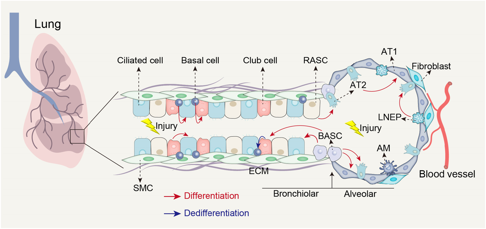 FIGURE 1. Stem cell populations involved in lung repair and regeneration following injury. Following airway injury, basal cells can differentiate into club cells and ciliated cells; club cells can differentiate into ciliated cells and possess the ability to dedifferentiate into basal cells when basal cells are depleted; BASCs can differentiate into both club cells and ciliated cells. Following alveolar injury, BASCs contribute to the replenishment of both AT1 and AT2 cells; LNEPs have the potential to differentiate into AT2 cells; RASCs can differentiate into AT2 cells, while AT2 cells themselves can differentiate into AT1 cells. AT1, Type 1 alveolar epithelial cells; SMC, Smooth muscle cell; ECM, Extracellular matrix; AM, Alveolar macrophages.
