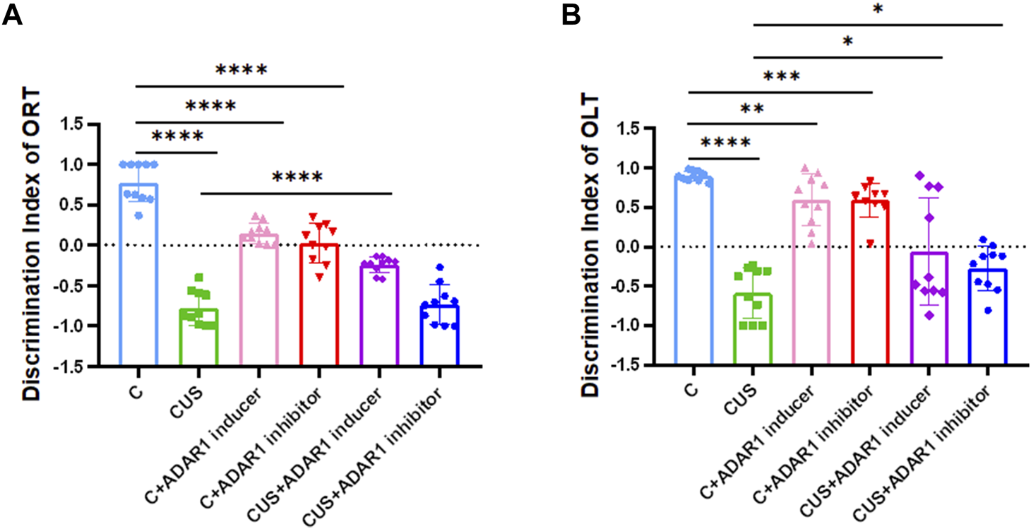 ADARl inducer alleviates spatial and non-spatial cognitive impairment in mice exposed to chronic unpredictable stressors. (A) Discrimination index of the mice in the new object recognition test (ORT). (B) Discrimination index of the mice in the new object location test (OLT); “C” represents normal control group, “CUS” represents chronic unpredictable stressors-treated model group, “C + ADARl inhibitor” represents ADARl inhibitor (PEN) intervention control group, “C + ADARl inducer” indicates ADARl inducer (INF-γ) intervention control group, “CUS + ADAR1 inducer” represents ADARI inducer intervention model group, and “CUS + ADARl inhibitor” indicates ADARl inhibitor intervention model group. *p < 0.05, **p < 0.01, ***p < 0.001, ****p < 0.0001, (n = 10/group). The data are expressed as mean ± standard deviation.