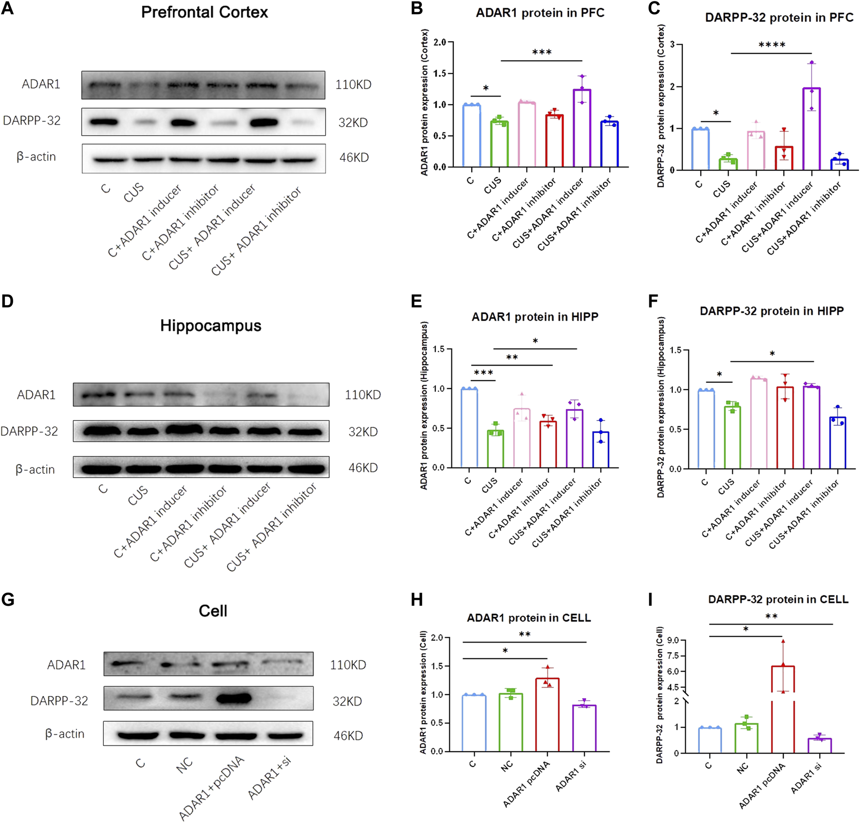 ADAR1 impacts DARPP32 protein expression in vivo and in vitro. (A) ADAR1 and DARPP-32 protein expression in prefrontal cortex of the mice. (B) Gray value analysis of ADARl protein expression in the prefrontal cortex of the mice. (C) Gray value analysis of DARPP-32 protein expression in the prefrontal cortex of the mice. (D) ADAR1 and DARPP-32 protein expressions in the hippocampus of the mice. (E) Gray value analysis of ADARl protein expression in the hippocampus of the mice. (F) Gray value analysis of DARPP-32 protein expression in hippocampus of the mice. “C” represents normal control group, “CUS” represents chronic unpredictable stressors treated model group, “C + ADAR1 inhibitor” represents the ADARl inhibitor (PEN/EHNA) intervention control group; EHNA was used in the results of (A-I), “C + ADARl inducer” indicates the ADARl inducer (IFN-γ) intervention control group, “CUS + ADAR1 inducer” represents the ADARl inducer intervention model group, and “CUS + ADAR1 inhibitor” indicates the ADARl inhibitor intervention model group. (G) ADARl and DARPP-32 protein expressions in ADARl over/low-expression PC12 cell lines. (H) Gray value analysis of ADARl protein expression in ADARl over/low-expression PC12 cell lines. (I) Gray value analysis of DARPP-32 protein expression in ADARl over/low-expression PC12 cell lines. “C” represents the normal control group, “NC” represents the negative empty vector group, “ADARl pcDNA” represents the ADARl over-expression group, and “ADARl si” represents the ADARl low-expression group. *p < 0.05, **p < 0.01, ***p < 0.001, ****p < 0.0001, (n = 3/group). Data are expressed as mean ± standard deviation.