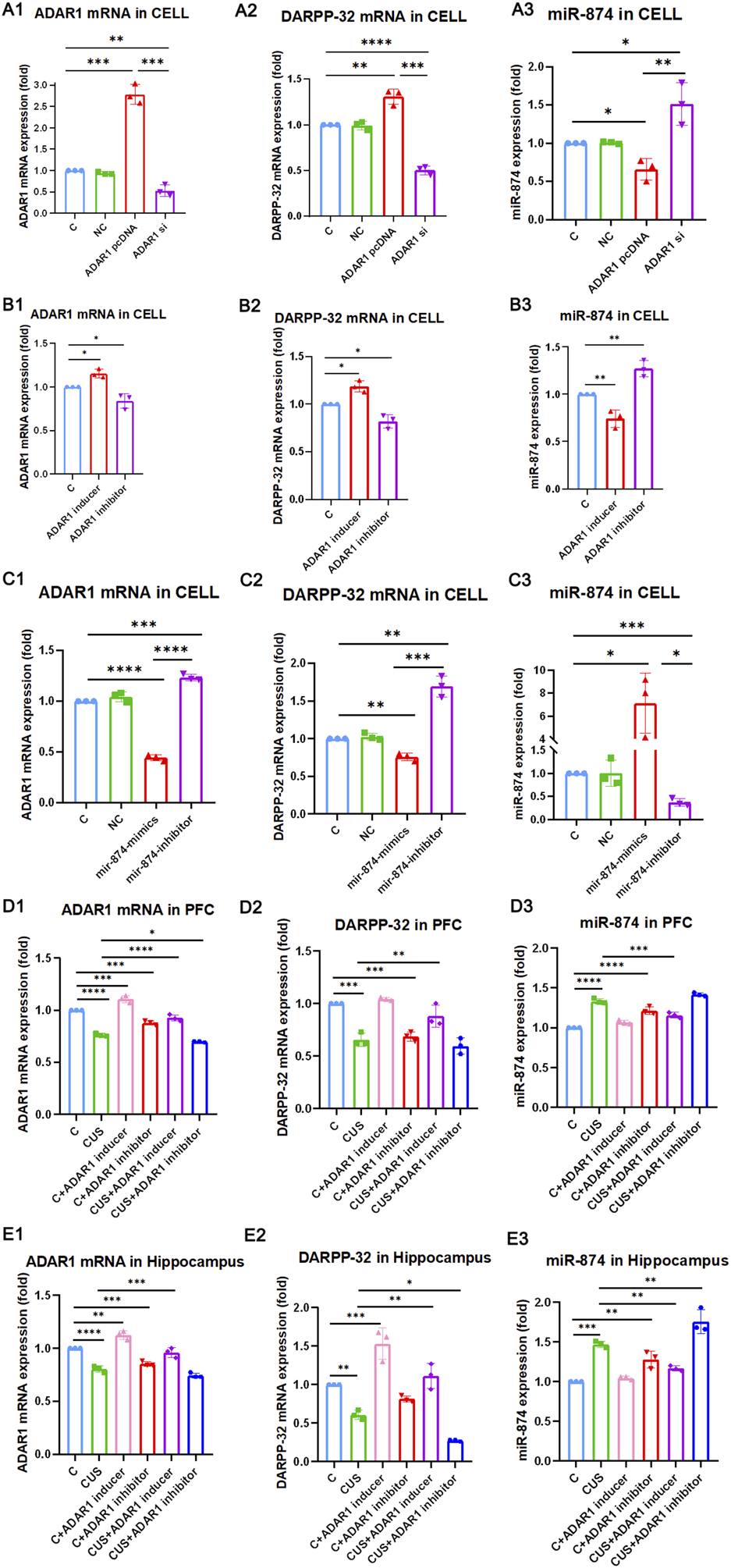 ADAR1 impacts DARPP-32 expression via miR-874-3p in vivo and in vitro. (A1-A3) ADAR1 high/low (A1) expression impacts DARPP-32 mRNA (A2) and miR-874-3p (A3) expression, respectively. (B1-B3) ADAR1 inducer (IFN-γ) and ADAR1 inhibitor (EHNA) impact ADAR1 mRNA (B1) DARPP-32 mRNA (B2) and miR-874-3p (B3) expression, respectively. (C1-C3) miR-874-3p high/low (C3) expression impacts ADAR1 (C1) and DARPP-32 (C2) mRNA expression, respectively. (D1-D3) ADAR1 inducer (IFN-γ) evidently recovered decreased ADAR1 mRNA (D1) and DARPP-32 mRNA (D2) and increased miR-874-3p (D3) expression induced by chronic unpredictable stressors, respectively, in the prefrontal cortex; meanwhile, ADAR1 inhibitor (EHNA) evidently aggravated decreased ADAR1 mRNA (D1) and showed the decreased tendency of DARPP-32 mRNA (D2) and increased tendency of miR-874-3p (D3) expression induced by chronic unpredictable stressors, respectively, in the prefrontal cortex. (E1-E3) ADAR1 inducer (IFN-γ) evidently recovered decreased ADAR1 mRNA (E1), decreased DARPP-32 mRNA (E2), and increased miR-874 (E3) expression induced by chronic unpredictable stressors, respectively, in the hippocampus; meanwhile, ADAR1 inhibitor (EHNA) evidently aggravated decreased DARPP-32 mRNA (E2) and increased miR-874 (E3) expression and also showed the decreased tendency of ADAR1 mRNA expression (E1) induced by chronic unpredictable stressors, respectively, in the hippocampus.