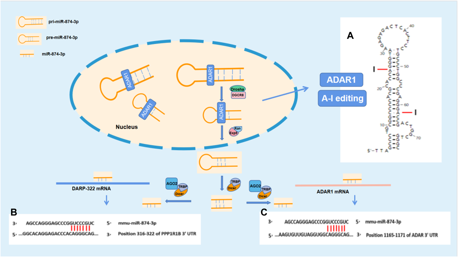 ADARl impacts DARPP-32 by acting on miR-874-3p. (A) The stem–loop structure of mmu-pre-miR-874 and the potential A-I editing sites; (B) and (C) show the potential binding sites for RNA interference between miR-874-3p and ADAR1 mRNA or DARP-32 mRNA, respectively. (B) Mmu-miR-874-3p contains seven sites binding to 3′UTR of ADAR mRNA; (C) mmu-miR-874-3p contains seven sites binding to 3′UTR of DARPP-32 mRNA.