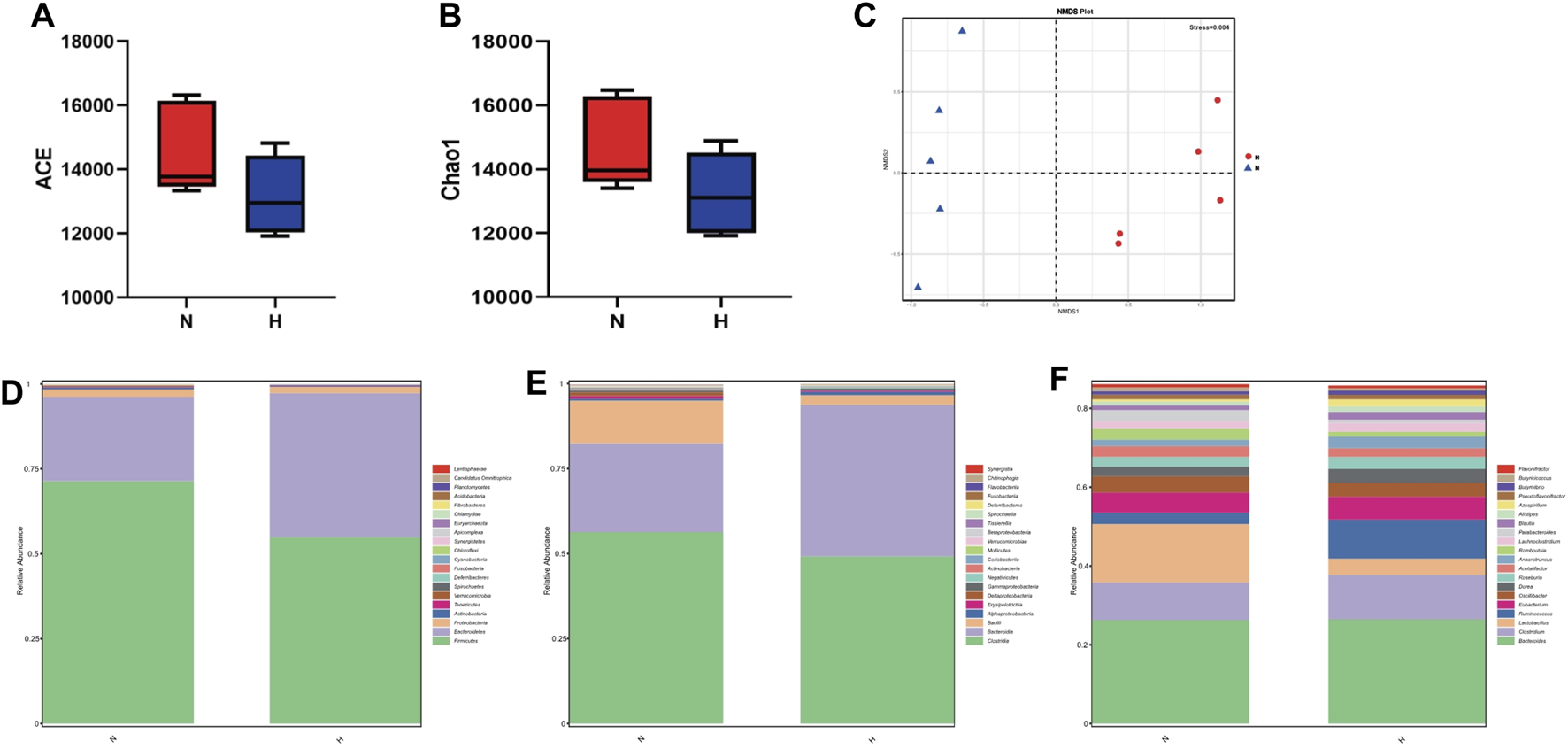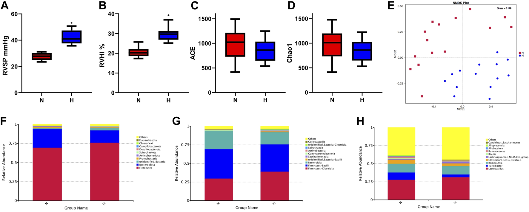 Intestinal microbial diversity and composition in the normoxia group and hypoxia-induced PH group. Differences in RVSP (A) and RVHI (B) between the two groups. Variation in diversity within the two groups by ACE (C) and Chao1 index (D). NMDS plots based on (E). Average relative abundances of dominant bacterial phyla (F), classes (G), and genera (H) in the intestine within the two groups. Normoxia group, n = 15; hypoxia-induced PH group, n = 14.