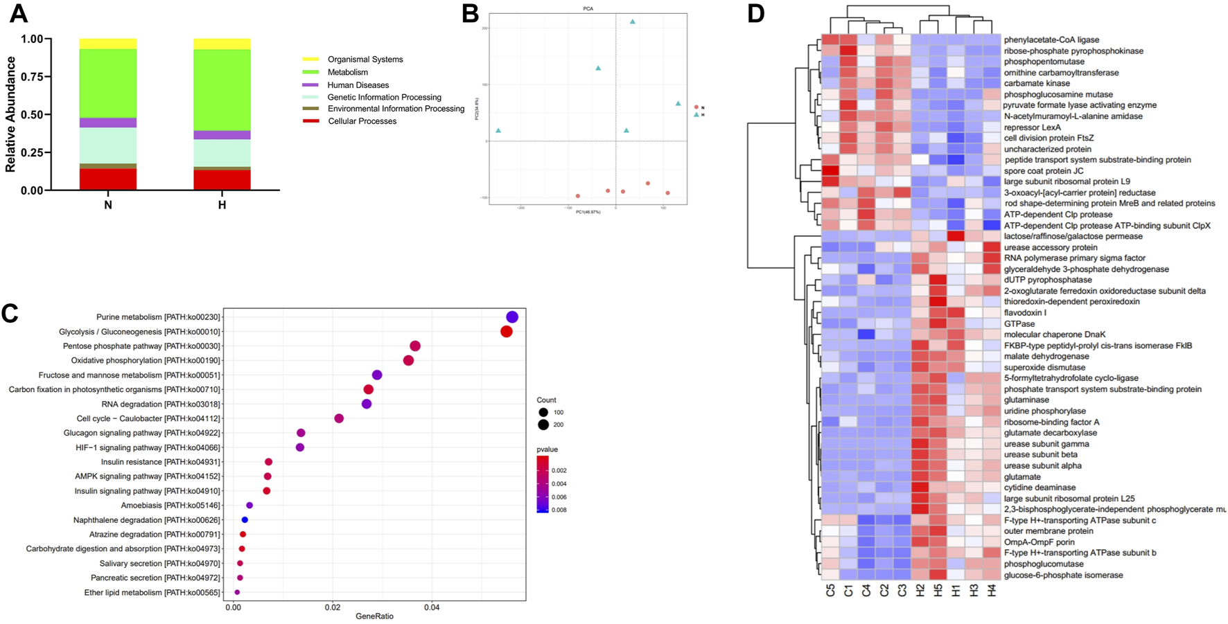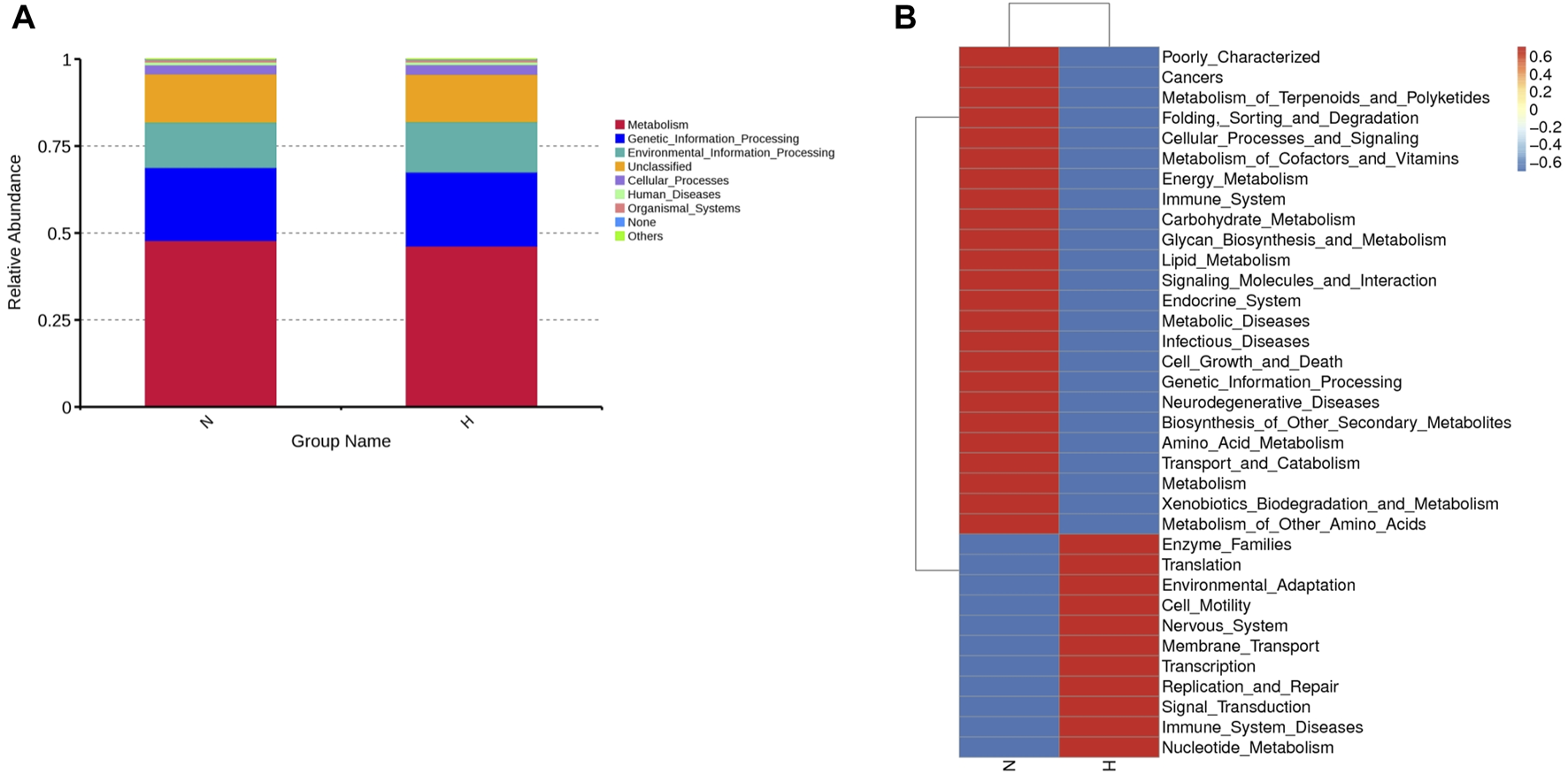 Using PICRUSt (version 1.1.4) to predict the function of intestinal microbes (Langille et al., 2013), it was found that the expression of some signaling pathways changed significantly, such as genetic information processing, metabolism processing and environmental processing. The functional genes that changed significantly in the hypoxia-induced PH and normoxic groups are shown in Figure 2.
