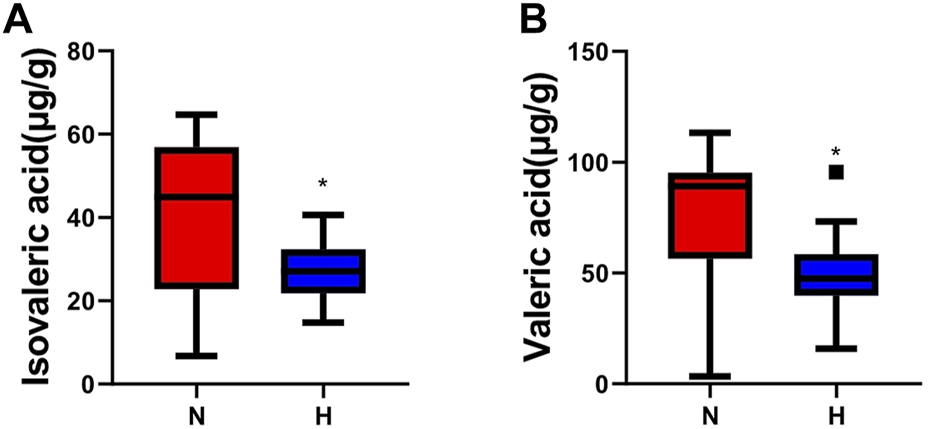 Changes in SCFAs in rats with chronic hypoxia-induced PH. The levels of isovaleric acid (A) and valeric acid (B) measured by GC‒MS in the normoxia group and hypoxia-induced PH group. The values are presented as the means ± SDs, *p < 0.05. Normoxia group, n = 15; hypoxia-induced PH group, n = 14.
