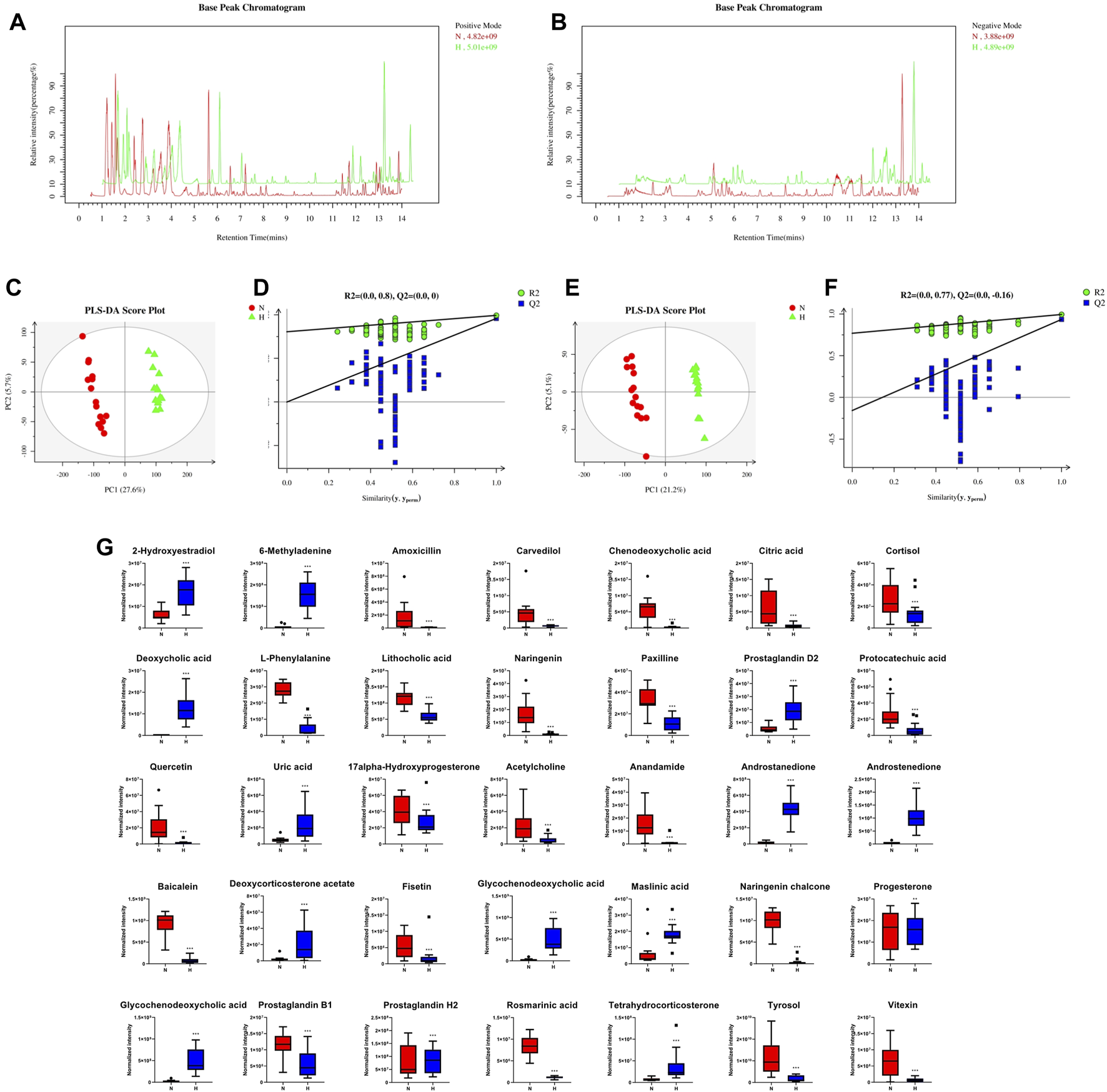 The effect of interference on the fecal metabolome. Typical LC–MS total ion current (TIC) chromatograms of nontarget metabonomics from the normoxia and hypoxia-induced PH groups in positive mode (A) and negative mode (B). (C) PLS-DA score plot of positive ions. (D) Permutation testing of positive ions. (E) PLS-DA score plot of negative ions. (F) Permutation testing of negative ions. (G) Fecal metabolite disorder between the normoxia and hypoxia-induced PH groups. The data are presented as the mean ± SD, and significant differences between groups are indicated as ***p < 0.001, **p < 0.01 and *p < 0.05. Normoxia group, n = 15; hypoxia-induced PH group, n = 14.