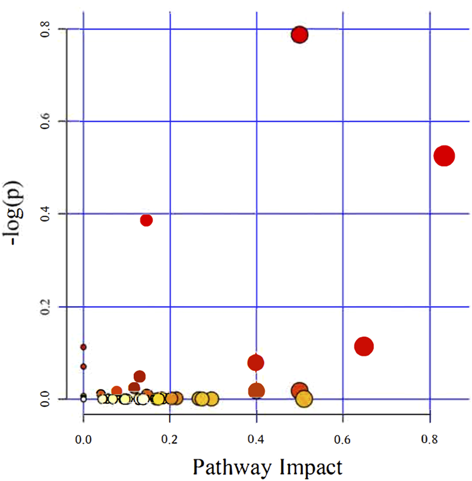 The KEGG pathways enriched and analyzed. Ingenuity pathway analysis. The size and color are based on the p-value and impact value, and a small p-value and large pathway impact value indicate that the pathway is greatly influenced.