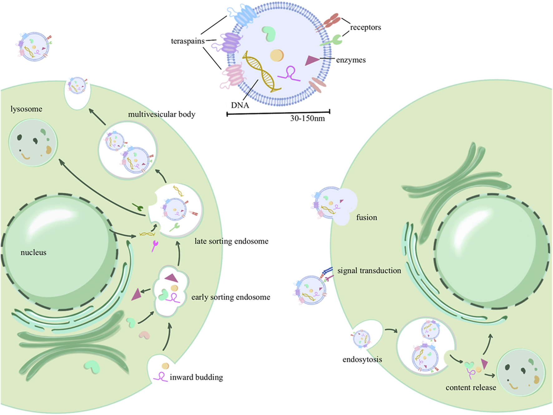 Exosome biogenesis involves a complex series of membrane fusion and sorting processes to encapsulate and sort contents. Initially, there is an invagination of the cell membrane, encapsulating extracellular components, to form early sorting endosomes (ESEs). These ESEs can then fuse with each other or engage in material exchange with internally synthesized substances, resulting in the formation of late sorting endosomes (LSEs). Further sorting and fusion lead to the formation of multivesicular bodies (MVBs) within the cell. MVB biogenesis involves various mechanisms, including the endosomal sorting complex required for transport (ESCRT) machinery for the transport-associated intraluminal vesicle (ILV) sorting, triggered by ESCRT-I/II, as well as non-ESCRT mechanisms (Colombo et al., 2014). After maturation and sorting of intraluminal vesicles (ILVs, also known as exosomes) within MVBs, two potential fates emerge: MVBs can either fuse with the cell membrane, budding internally and releasing exosomes into the extracellular space, or they may undergo fusion with lysosomes for cargo degradation (Broad et al., 2023). Upon transport and docking at the plasma membrane, secretory MVBs bind to the cell’s inner membrane receptors (such as soluble N-ethylmaleimide-sensitive factor attachment protein receptor, SNARE), initiating release (Bebelman et al., 2018). As depicted in Figure 1, exosome formation involves multiple rounds of sorting and assembly, resulting in significant heterogeneity among exosomes. This heterogeneity is not only evident in their varying particle sizes but, more importantly, in their unique structures and compositions.