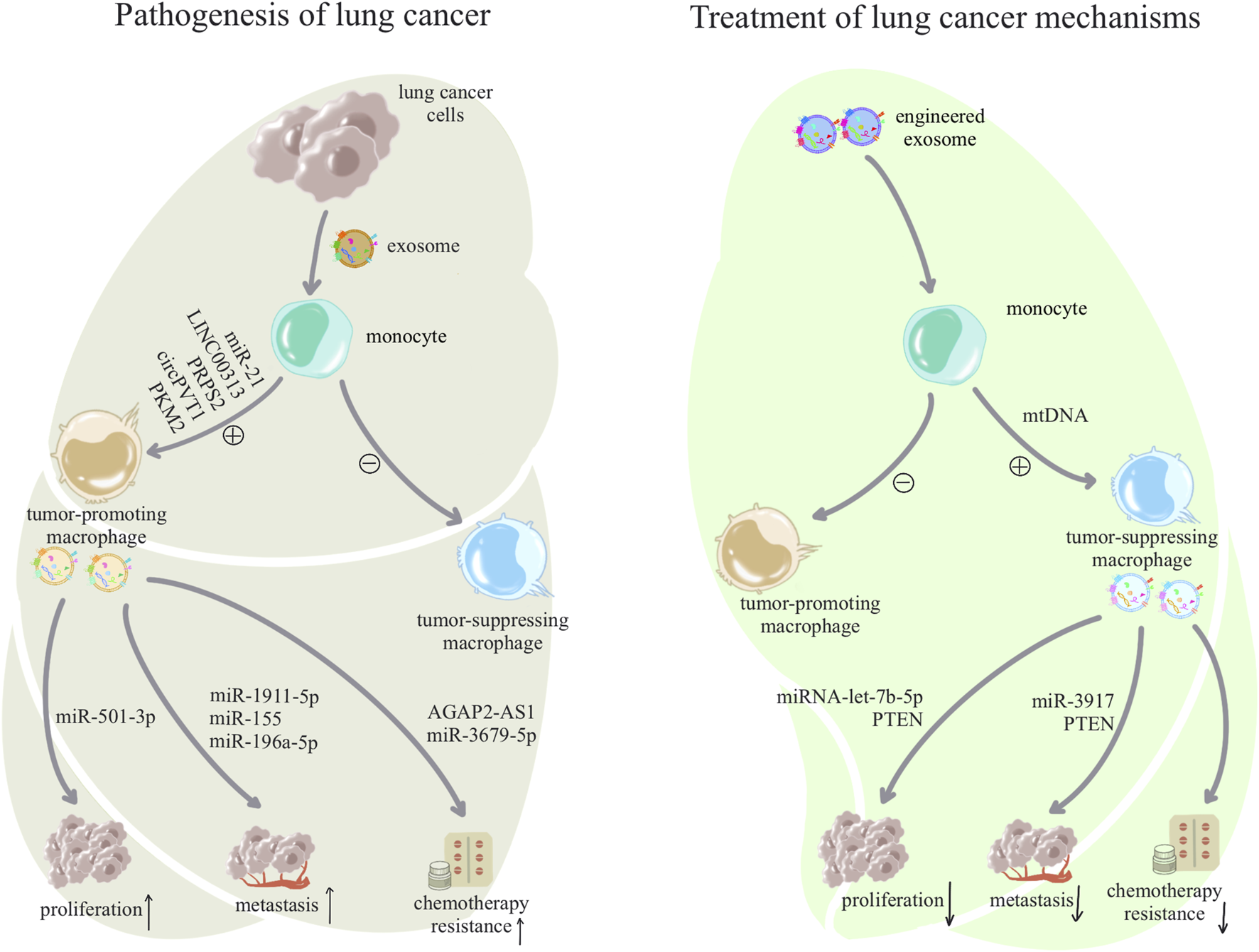 Pathogenesis and treatment of exosome-associated lung cancer: lung cancer cells use exosomes to alter macrophage subpopulations to form a tumor microenvironment, and dysregulated macrophages facilitate a variety of malignant behaviors such as growth, metastasis, and drug resistance of lung cancer cells through exosomes. In contrast, treatment of lung cancer can begin by awakening anti-tumor macrophages in macrophages and inhibiting tumor-assisting macrophages, and anti-tumor macrophages will also inhibit the proliferation and development of tumor cells through exosomes.