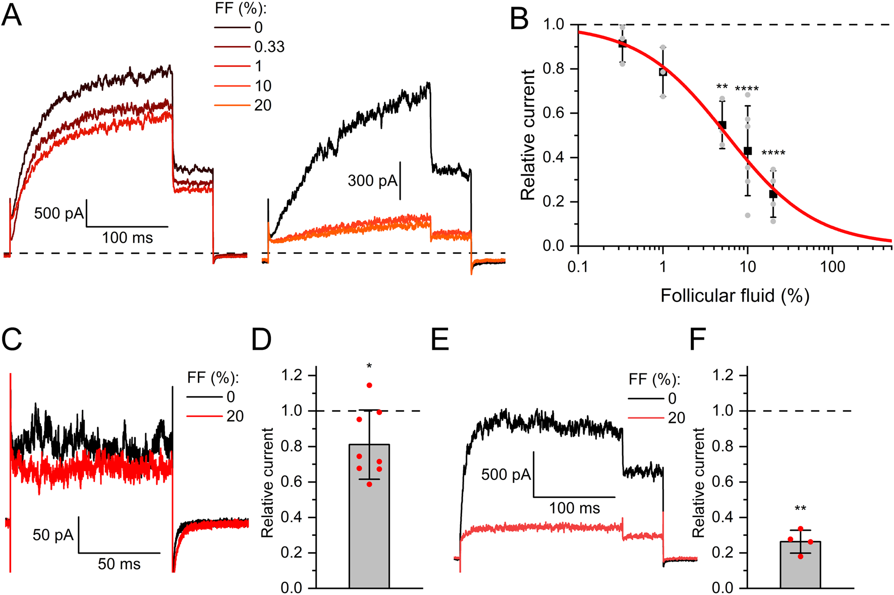 Figure 2. Human Slo3 is inhibited by follicular fluid (A) Slo3 currents before and after perfusion with dilute (%) solutions of follicular fluid (FF). (B) Current amplitudes (mean ± SD) at +100 mV in the presence of a given dilution of follicular fluid relative to that under control conditions (set to 1) (n ≥ 3). Grey dots indicate individual values. The continuous red line represents a fit of the Hill equation, yielding the dose-response relationship (ID50 = 5.7 ± 0.5%, Standard error of the fit). (C) Slo3 currents recorded from human sperm at +100 mV before and after perfusion with FF. (D) Current amplitudes (mean ± SD) in the presence of FF relative to that under control conditions (set to 1) (n = 8). (E) Slo3 currents recorded from CHO cells in the presence of 1 mM intracellular Ca2+ and pH 8.0 before and after perfusion with FF. (F) Current amplitudes (mean ± SD) in the presence of FF relative to that under control conditions (set to 1) (n = 4). *p < 0.05, **p < 0.01, ****p < 0.0001.