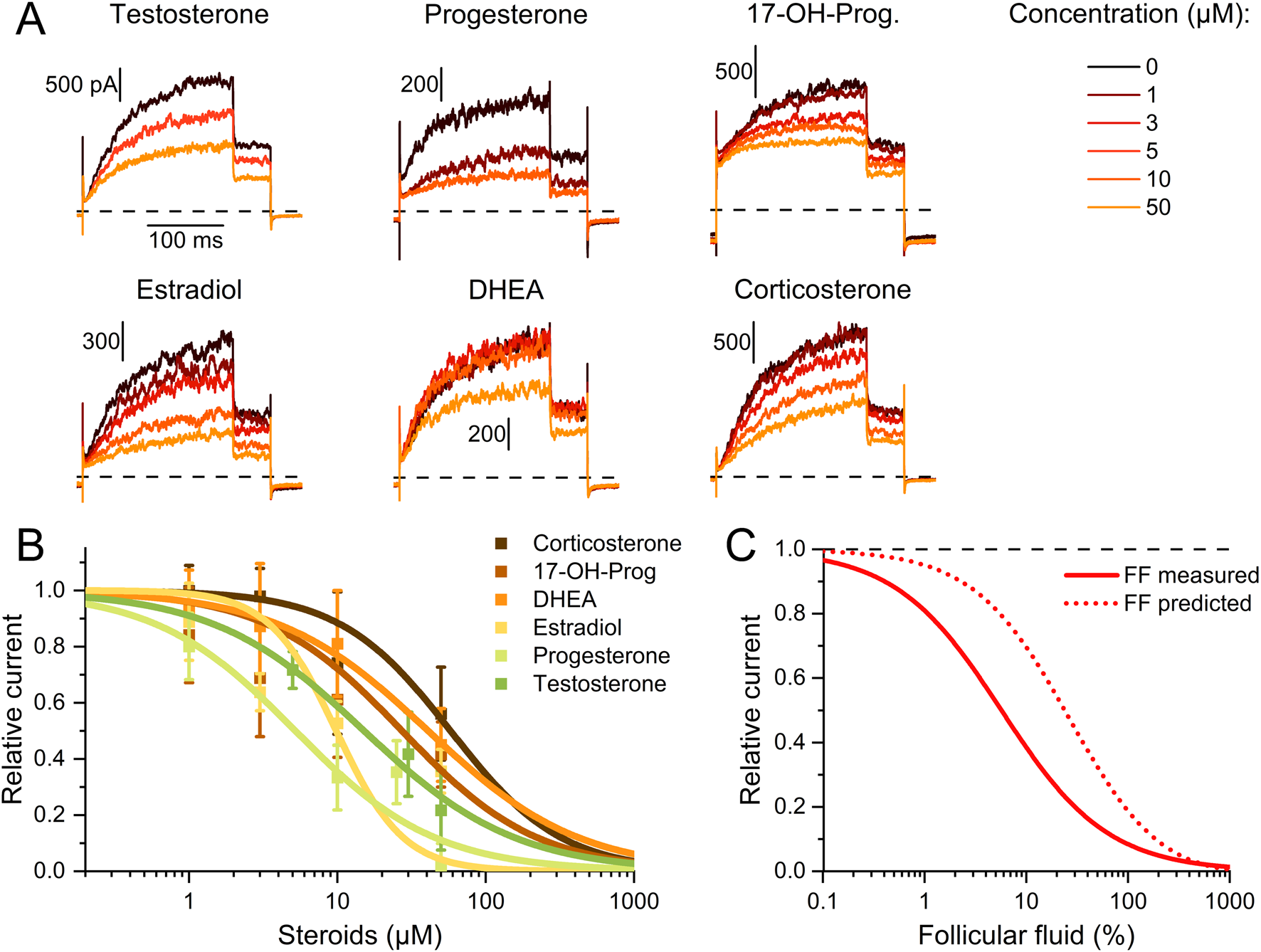 Figure 4. Dose-response relationship for the steroid inhibition of human Slo3 (A) Slo3 currents before and after perfusion with different concentrations of a given steroid. (B) Current amplitudes (mean ± SD) at +100 mV in the presence of different concentrations of the respective steroid relative to that under control conditions (set to 1) (n ≥ 3). Continuous lines represent fits of the Hill equation to yield the dose-response relationships (n ≥ 3). (C) Experimentally determined dose-response relationship of the Slo3 inhibition by follicular fluid shown in Figure 2B (FF, continuous line) and modelled dose-response relationship (dotted line) assuming that its action exclusively rests on the contained steroids (see explanation in the text).