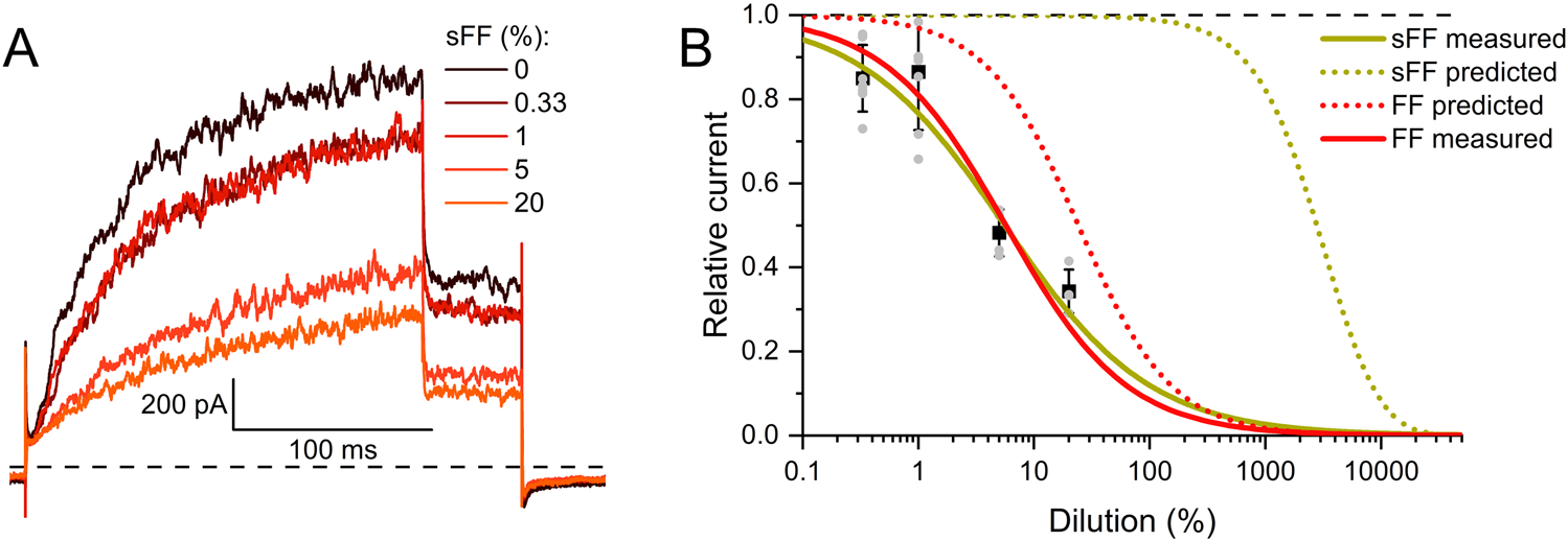 Figure 5. Human Slo3 is inhibited by charcoal-stripped follicular fluid (A) Slo3 currents before and after perfusion with dilute (%) solutions of charcoal-stripped follicular fluid (sFF). (B) Current amplitudes (mean ± SD) at +100 mV in the presence of a given dilution of sFF relative to that under control conditions (set to 1) (n ≥ 3). Grey dots indicate individual values. The continuous green line represents a fit of the Hill equation, yielding the dose-response relationship (ID50 = 5.7 ± 1.3%, Standard error of the fit). For comparison, the dose-response relation for FF from Figure 2B is shown in red. Additionally, the predicted dose-response relations based on the steroid concentrations determined in FF (dotted red) and sFF (dotted green) are shown.