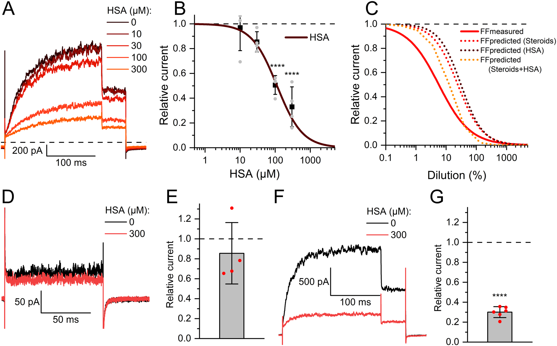 Figure 6. Human serum albumin inhibits human Slo3 (A) Slo3 currents before and after perfusion with different concentrations of albumin. (B) Current amplitudes (mean ± SD) at +100 mV in the presence of given concentration of albumin relative to that under control conditions (set to 1) (n = 4). The continuous line represents a fit of the Hill equation to yield the dose-response relationship. Grey dots indicate individual recordings. (C) Comparison of measured (continous red line) and predicted dose-response relations for FF based on the contained concentrations of steroids (dotted red line), HSA (dotted brown line), or both (dotted orange line). (D) Slo3 currents recorded from human sperm at +100 mV before and after perfusion with albumin. (E) Current amplitudes (mean ± SD) in the presence of albumin relative to that under control conditions (set to 1) (n = 4). (F) Slo3 currents recorded from CHO cells in the presence of 1 mM intracellular Ca2+ and pH 8.0 before and after perfusion with albumin. (G) Current amplitudes (mean ± SD) in the presence of albumin relative to that under control conditions (set to 1) (n = 6); ****p < 0.0001.