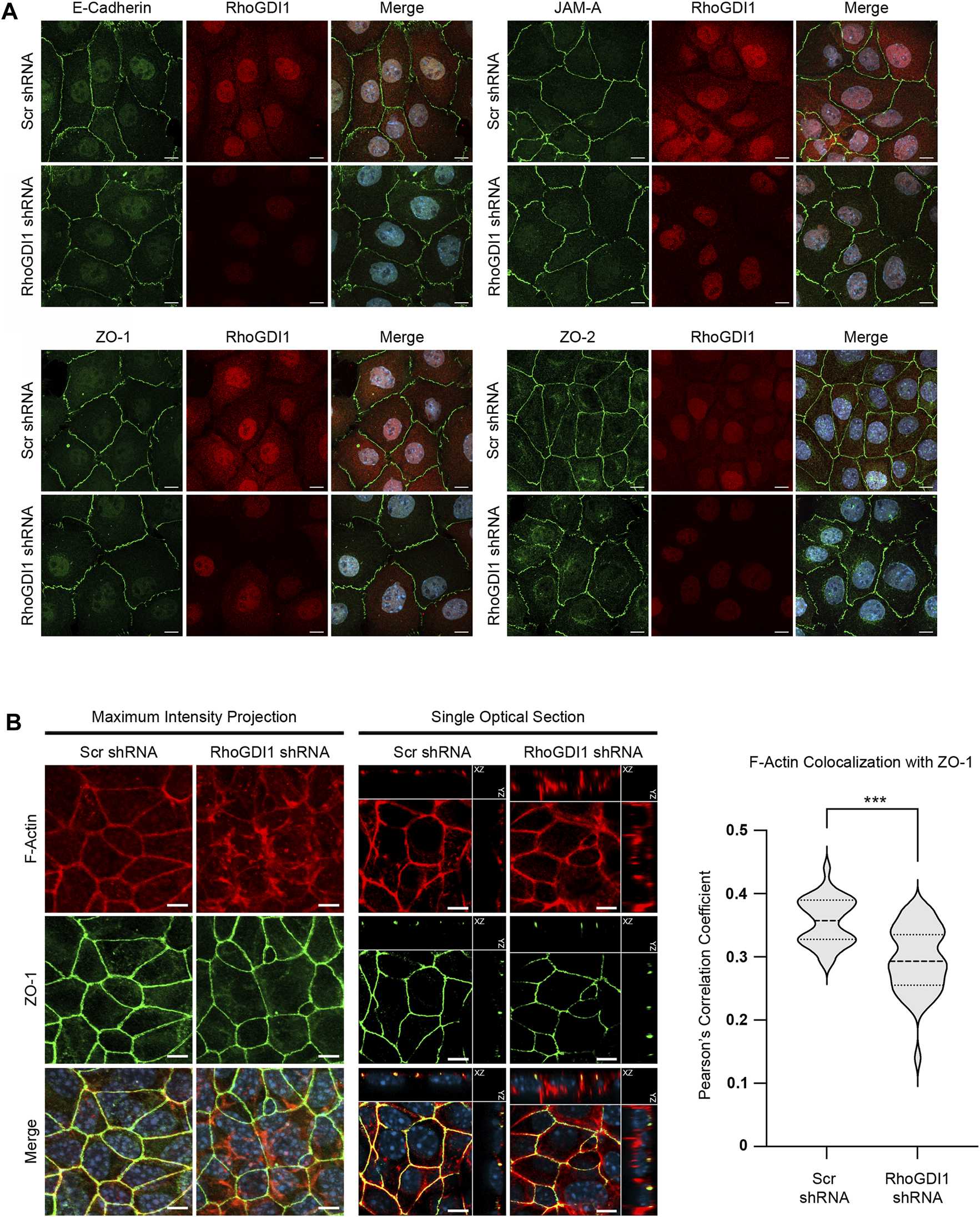 RhoGDI1 depletion does not alter the localization of proteins associated with AJs and TJs but alters F-actin distribution. (A) Immunofluorescence analysis of cell-cell junctions of RhoGDI1-depleted Eph4 cells. Eph4 cells expressing scrambled shRNAs (Ctrl KD) and Eph4 cells expressing RhoGDI1 shRNAs (RhoGDI1 KD) were fixed and stained with antibodies against RhoGDI1 together with antibodies against E-cadherin, JAM-A, ZO-1 or ZO-2 as indicated. Note that all AJ- and TJ-localized proteins are normally localized at cell-cell contacts of RhoGDI1 KD Eph4 cells. Scale bars: 10 µm. (B) Immunofluorescence analysis of Eph4 cells transfected with scrambled shRNA (Scr shRNA) or RhoGDI1-specific shRNAs (RhoGDI1 shRNA) were grown on polycarbonate filters to enhance apico-basal polarization and stained with antibodies against ZO-1 and with fluorescently labeled phalloidin to visualize F-actin as indicated. Maximum intensity projections (scale bars: 5 µm) and single optical sections (scale bars: 5 µm) are shown. In single optical sections, XZ and YZ projections are separated from the XY projections by solid lines. Right panel: Quantification of F-actin colocalization with ZO-1. The F-actin and ZO-1 fluorescence intensities were analyzed using Imaris software. Data shows the colocalization of F-actin fluorescence with the ZO-1 fluorescence and is depicted as Pearson’s correlation coefficient. Statistical analysis was performed with unpaired, two-tailed Student’s t-test. Data was obtained and data points were pooled from at least 10 randomly chosen fields of view (FOV) per experiment derived from three independent experiments (Scr shRNA: 12, 12, 11 FOVs; RhoGDI1 shRNA: 10, 15, 15 FOVs), with each FOV containing approximately 100 cells. Data is presented as Violin plot. Bold broken lines indicate median values, thin broken lines indicate first and third quartiles. ***p < 0.001.