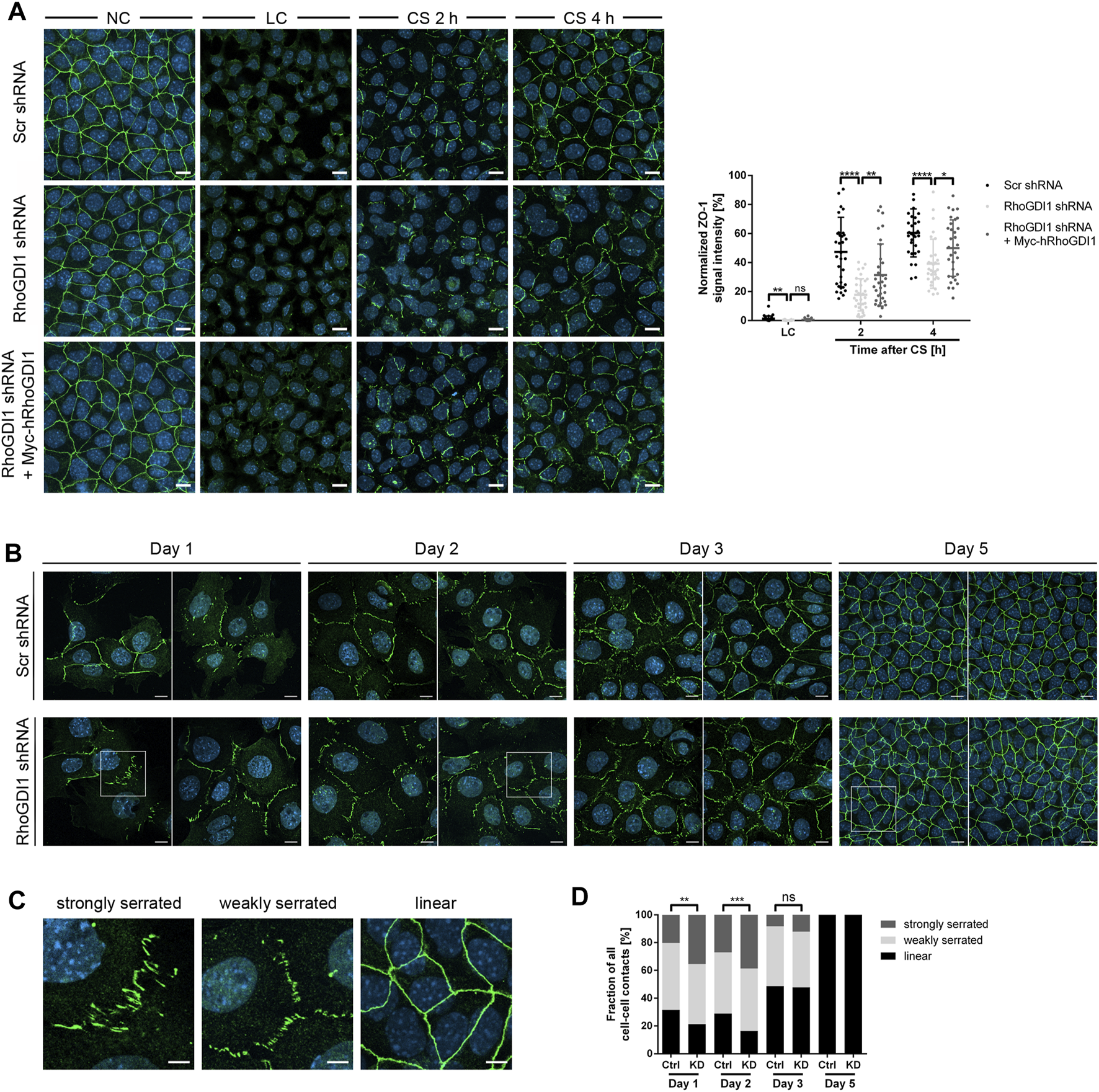 RhoGDI1 is required for the timely maturation of cell-cell contacts. (A) Eph4 cells (Scr shRNA, RhoGDI1 shRNA, RhoGDI1 shRNA + Myc-hRhoGDI1) were either cultured under normal Ca2+ conditions (NC) or were cultured under low Ca2+ conditions (LC) and either fixed immediately (LC) or supplemented with normal medium (Ca2+ switch, CS) for 2 h or 4 h. Cells were stained for ZO-1 (green fluorescence) as marker for cell-cell contacts (Yonemura et al., 1995) and for DNA (DAPI, blue fluorescence). Left panels: Representative ZO-1 immunofluorescence pictures taken at the indicated time point before and after CS. Scale bars: 10 µm. Right panel: Quantification of ZO-1 localization at different time points after CS as indicated. The ZO-1 IF intensities were analyzed using ImageJ software, data were normalized to the ZO-1 intensities observed in cells grown under normal Ca2+ conditions (NC, 100%). Statistical analysis was performed with unpaired, two-tailed Student’s t-test. Data is derived from at least 30 independent fields of view derived from three independent experiments. Data are presented as mean values ± SD. ns, not significant; *p < 0.05, **p < 0.01, ****p < 0.0001. Abbreviations: NC, normal Ca2+ conditions; LC, low Ca2+ conditions; CS, Ca2+ switch. (B) Eph4 cells (Scr shRNA, RhoGDI1 shRNA) seeded at low density were grown for different time periods, then fixed and stained for ZO-1 (green fluorescence) to visualize cell-cell junctions and with DAPI (blue fluorescence) to visualize nuclei. Two representative images are shown for each condition. Squares indicate areas shown at higher magnifications in (C). Scale bars: 10 µm. (C) Representative images of junction phenotypes arbitrarily defined as strongly serrated, weakly serrated, and linear. Scale bars: 5 µm. (D) Quantification of junction phenotypes. Classification of junction phenotypes was performed as detailed in the Methods section. Statistical analysis was performed with Chi-Square test. Data is derived from at least 10 randomly chosen fields of view in each experiment with a total number of at least 187 cell-cell contacts analyzed. Data is derived from three independent experiments. ns, not significant, **p < 0.01, ***p < 0.001.
