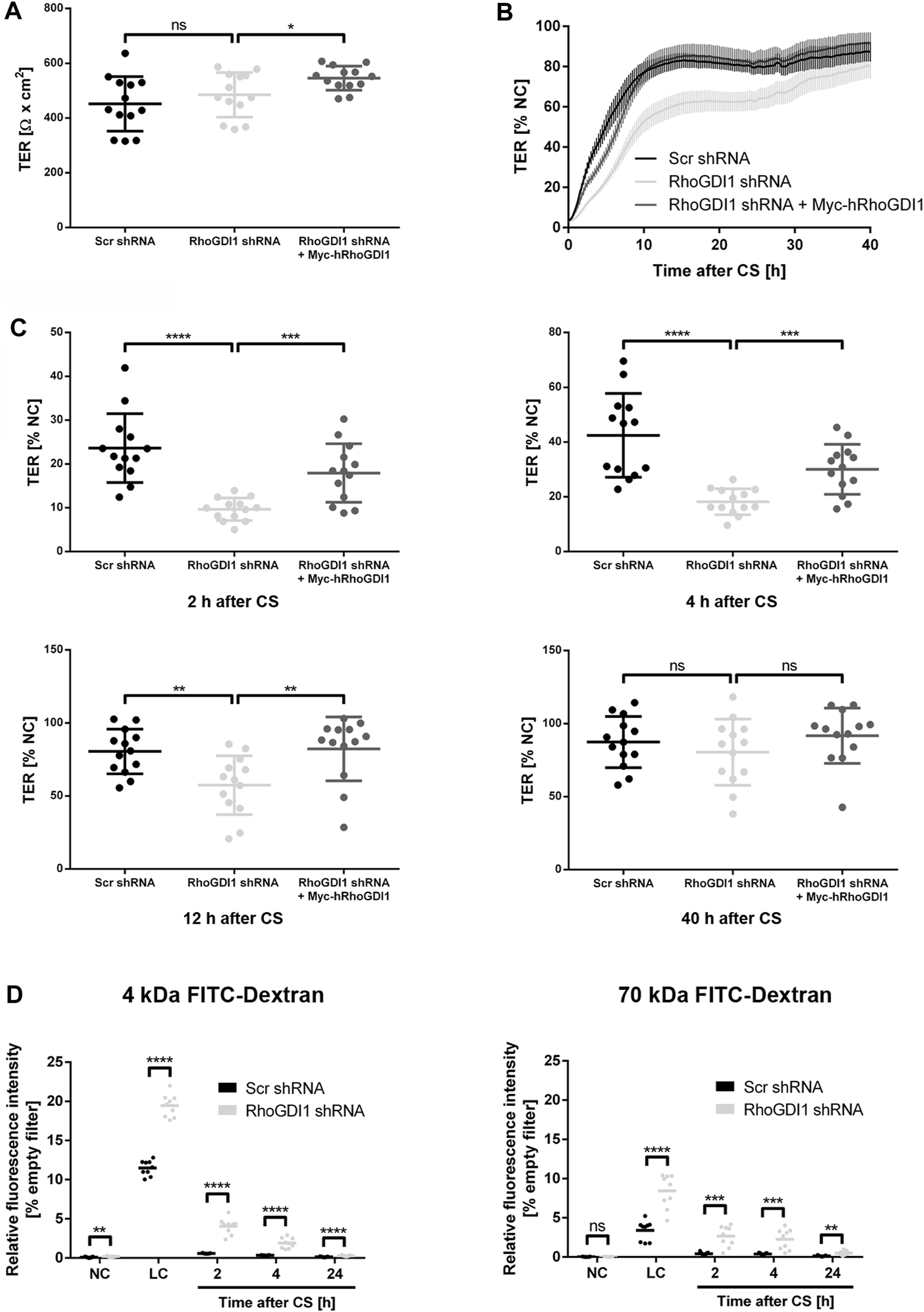 RhoGDI1 is required for the timely development of the epithelial barrier. (A–C) TER analysis of Eph4 cells expressing either a scrambled shRNA (Scr shRNA), a RhoGDI1 shRNA (RhoGDI1 shRNA) or a RhoGDI1 shRNA together with a shRNA-insensitive human RhoGDI1 construct (RhoGDI1 shRNA + Myc-hRhoGDI1). Cells were grown on polycarbonate filters. TER was measured using an automated multi-well device as described in the Methods section. (A) TER at steady state. Data are presented as mean values ± SD. (B) TER after CS. Cells were grown to confluency on polycarbonate filters and subjected to CS to induce new cell-cell contact formation. TER was recorded over 40 h after CS using an automated multi-well device and is depicted as percentage of the TER measured under normal Ca2+ conditions (NC). Data are presented as mean values ± SEM. (C) Quantification of TER values measured 2 h, 4 h, 12 h, and 40 h after CS. Data are presented as mean values ± SD. (D) Paracellular permeability for FITC dextran. Cells grown to confluency on polycarbonate filters were subjected to CS to induce new cell-cell contact formation as described above. The concentration of FITC-labelled dextran (4 kDa FITC-dextran, 70 kDa FITC-dextran) in the lower compartments was measured at the indicated time points. Data is indicated as the FITC fluorescence relative to the FITC fluorescence measured in samples with empty filters. Data are presented as mean values. Statistical analyses in this figure were performed with unpaired, two-tailed Student’s t-test. Data is derived from four independent experiments (A–C) or three (D) independent experiments using at least triplicate measurements in each experiment. Individual filters are represented by individual symbols in the graphs. ns, not significant, *p < 0.05, **p < 0.01, ***p < 0.001, ****p < 0.0001. Abbreviations: NC, normal Ca2+ conditions; LC, low Ca2+ conditions, CS, Ca2+ switch.