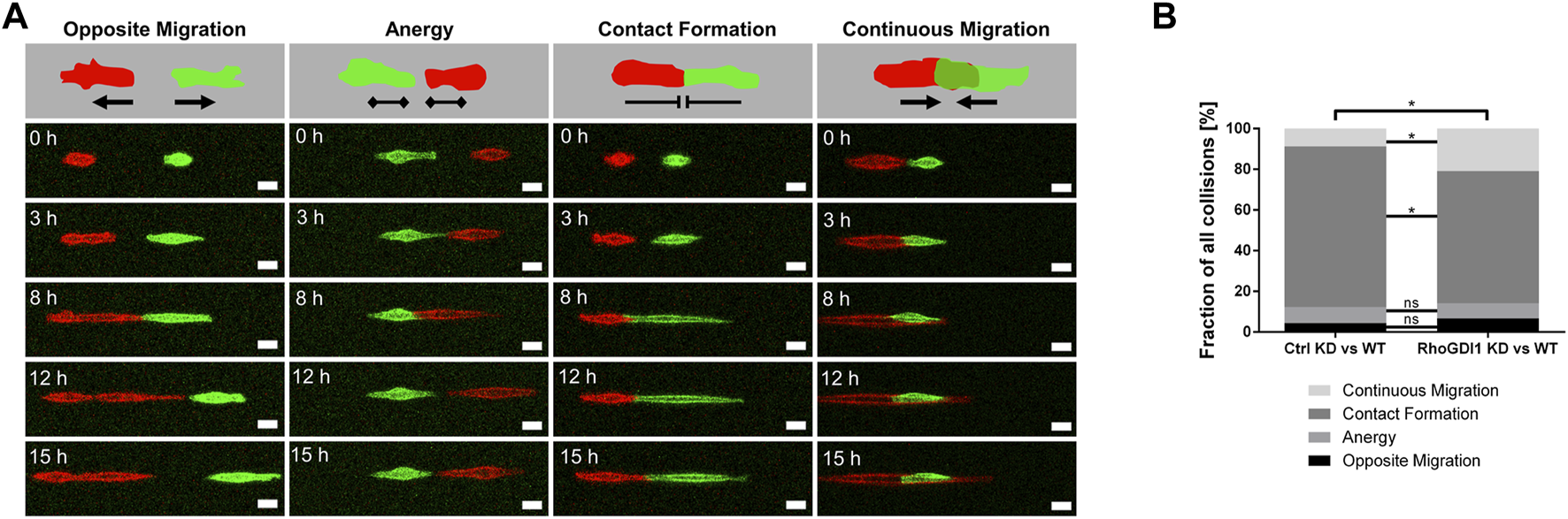 RhoGDI1 regulates contact inhibition of locomotion. (A) 1D kinematic CIL assay. Ctrl Eph4 cells or RhoGDI1 KD Eph4 cells (labeled with LA-EGFP) were co-cultured with WT Eph4 cells (labeled with LA-mCherry) on linear micropatterns (width: 5 µm) and observed by live microscopy for 15 h. Cartoons: Types of CIL behavior after cell-cell collision: Opposite migration, Anergy, Contact Formation, Continuous Migration. Bottom panels: Still images of movies representative for different types of CIL behavior. Scale bars: 20 µm. (B) Quantification of CIL types after cell collisions of scrambled shRNA-expressing Eph4 cells with WT Eph4 cells (Ctrl KD vs. WT) and of RhoGDI1 shRNA-expressing Eph4 cells with WT Eph4 cells (RhoGDI1 KD vs. WT). Statistical analysis was performed with Chi-Square test with Bonferroni corrections. Data are presented as mean values. ns, not significant, *p < 0.05. Number of collisions: n = 138 for Ctrl KD–WT (4 independent experiments), n = 163 for RhoGDI1 KD–WT (4 independent experiments).