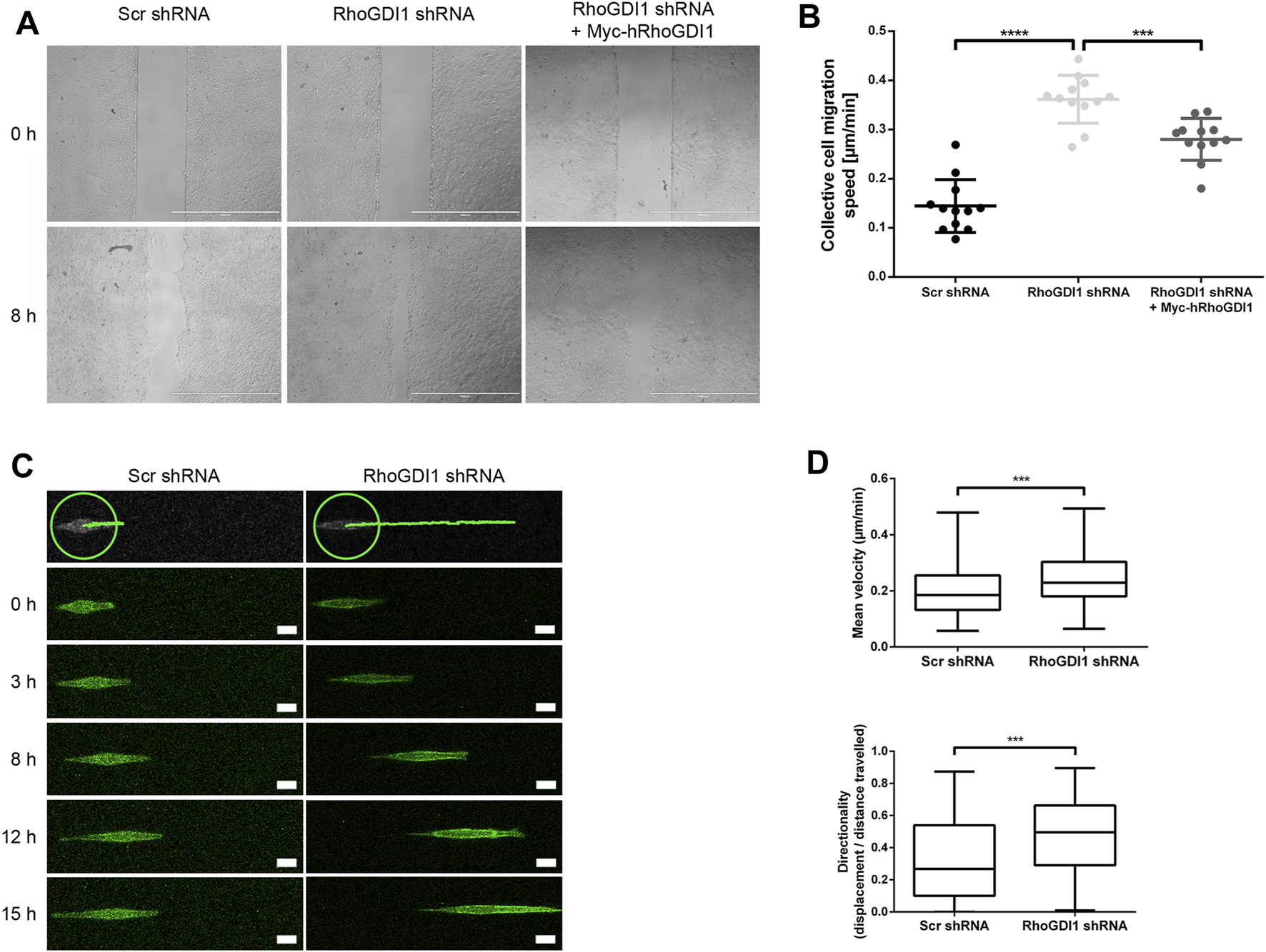 RhoGDI1 regulates cell migration of Eph4 cells. (A) Monolayer expansion assays of scrambled shRNA-transfected Eph4 cells (Scr shRNA), RhoGDI1 shRNA-transfected Eph4 cells (RhoGDI1 shRNA), and RhoGDI1 shRNA-transfected Eph4 cells expressing a shRNA-insensitive hRhoGDI1 construct (RhoGDI1 shRNA + Myc-hRhoGDI1). Cells were seeded on FN-coated microscope slides separated by a silicone stamp. Collective cell migration was triggered by stamp removal. The migration velocity of the cell collective was quantified by measuring the cell-free area directly after the removal of the stamp and 8 h later (see Methods section for details). Representative images of monolayer expansion immediately after stamp removal (0 h) and after 8 h (8 h). Scale bars: 1000 µm. (B) Quantifications of collective cell migration velocities. Statistical analysis was performed with unpaired, two-tailed Student’s t-test. Each dot represents one biological replicate (one independent cell population). Data are presented as mean values ± SD. Number of independent cell populations analyzed: n = 12 for each cell line (3 independent experiments). ***p < 0.001, ****p < 0.0001. (C) 1D kinematic assays of RhoGDI1-depleted cells. Control cells (Scr shRNA) and RhoGDI1-depleted cells (RhoGDI1 shRNA) expressing LA-EGFP were cultured on linear micropatterns (width: 5 µm) and observed by live microscopy for 15 h. Still images show single cells migrated on linear tracks at different time points.The top panels show the distances covered by the cells after the observation period. The green circles indicate the positions of the cells at the beginning of the observation period. Scale bars: 20 µm. (D) Quantification of mean velocity (top panel) and directionality (bottom panel) of single cells cultured on linear micropatterns. Analysis was performed using the TrackMate Plugin for ImageJ software. Statistical analysis was performed with two-sided Mann-Whitney U-Test. Number of cells analyzed: n = 101 (Scr shRNA) and n = 91 (RhoGDI1 shRNA) (3 independent experiments). ***p < 0.001.