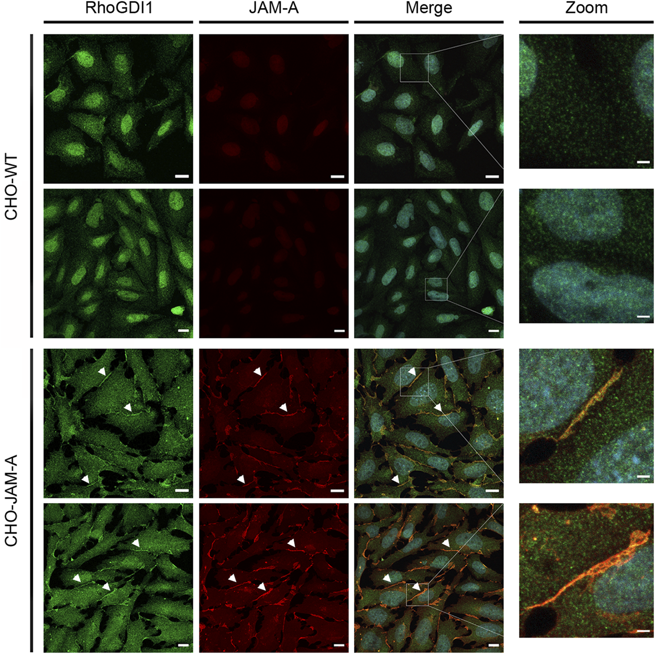 Given the dynamic regulation of Rho family small GTPases at cell-cell contacts during junction formation and during the development of membrane polarity we addressed the question if cell adhesion receptors of the JAM family recruit RhoGDI1 to cell-cell contacts. We used CHO cells since these cells lack classical adhesion receptors including JAMs, cadherins or nectins. Ectopic expression of these cell adhesion receptors results in the recruitment of cytoplasmic binding partners to cell-cell junctions (Ebnet et al., 2001; Ebnet et al., 2003; Miranda et al., 2003; Iden et al., 2006; Meng et al., 2019), making these cells a suitable system to analyze the ability of a single adhesion receptor to recruit cytoplasmic proteins to cell-cell contacts. In non-transfected CHO cells RhoGDI1 was not detectable at cell-cell contacts. In CHO cells expressing JAM-A, however, RhoGDI1 strongly co-localized with JAM-A at cell-cell contacts (Figure 6) indicating that JAM-A can recruit RhoGDI1 to cell-cell junctions.